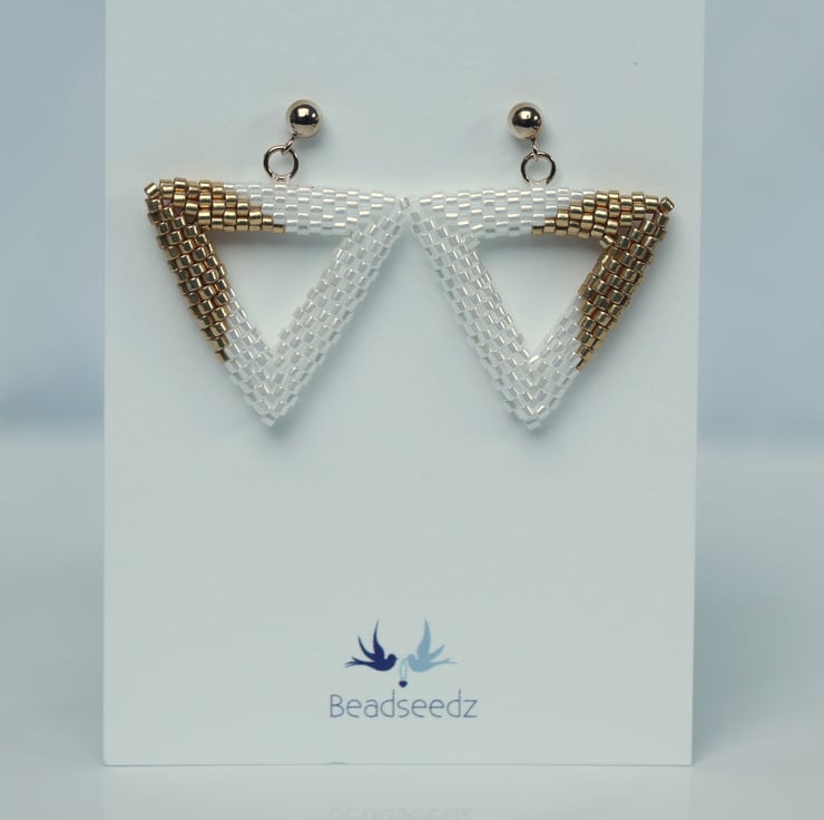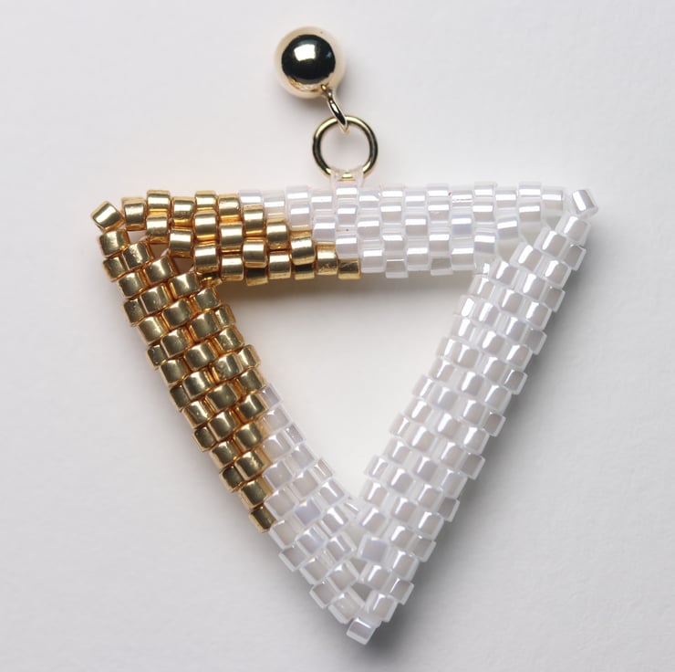 To make these earrings I have used size 11 gold coloured and shiny white Miyuki Delica beads. They are made by a process called beadweaving, by which the beads are sewn together by strong Fireline beading thread (not unlike fishing line).