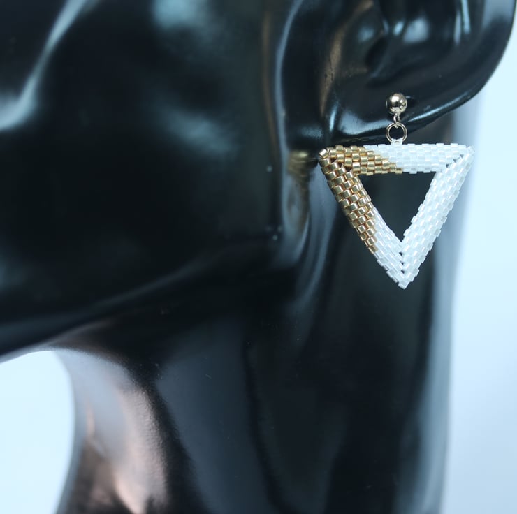 A stylish pair earrings, triangular in shape, in white and gold. The stud ear-posts are rolled gold (also known as gold filled). Gold filled items have significantly more gold coating on them than gold plated and the coating is, consequently, much more durable.
