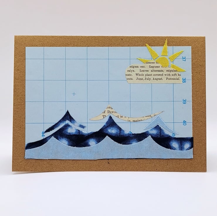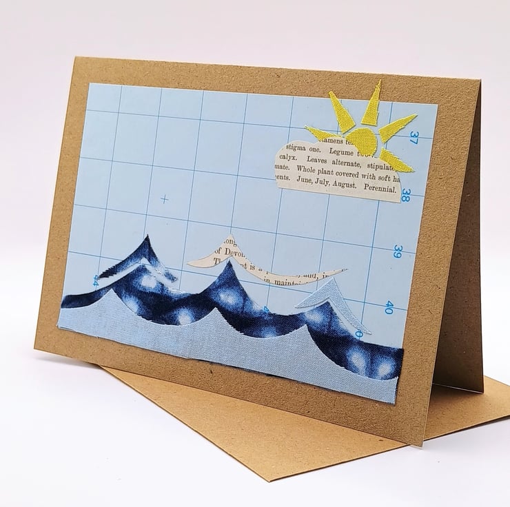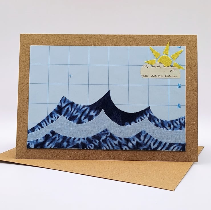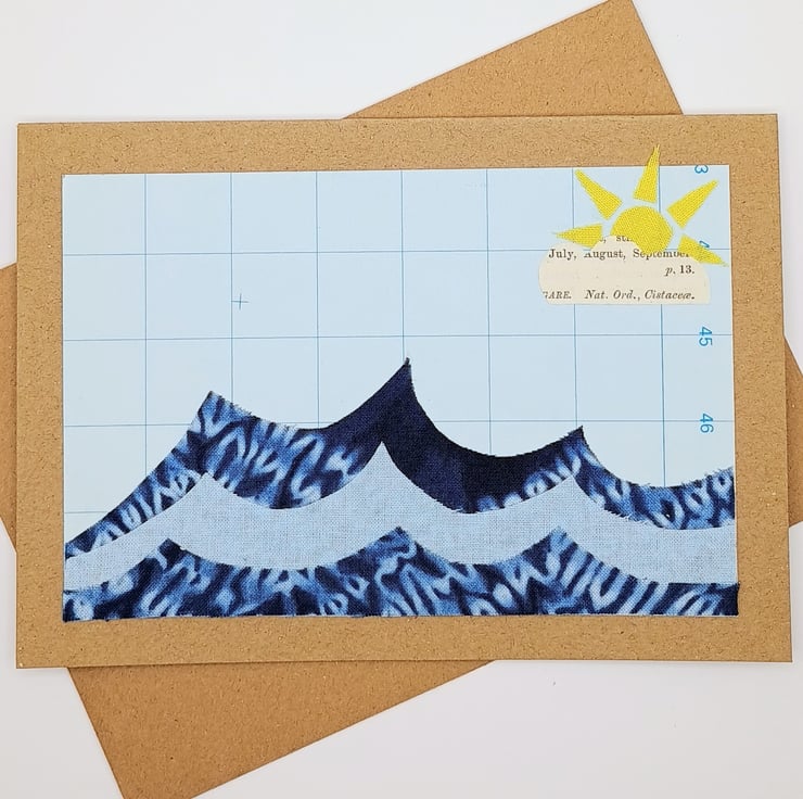 A pack of 2 collaged ‘Sunny waves’ blank greetings cards. They are ideal for any occasion from birthdays, thank yous to get well soon. A combination of paper and fabric embodies sunnier days to come. Perfect for any occasion.