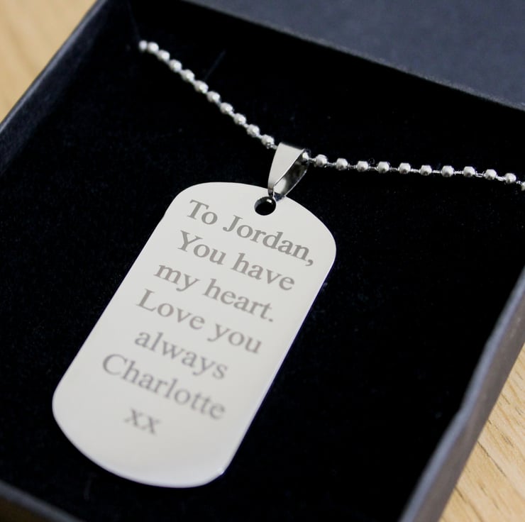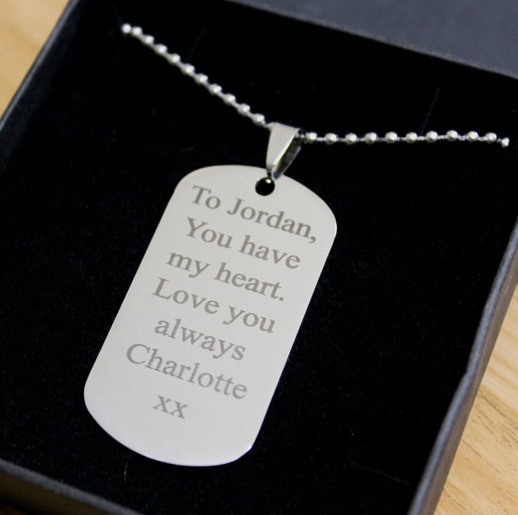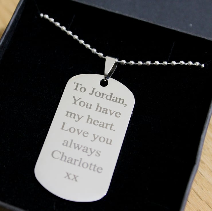 Gift box colour/design may vary. All photographs are taken by myself. As your necklace is personally engraved to your specification, regretfully we are unable to offer refunds on personalised engraved items. If you require a particular font please contact us. Photos show just an example of engraving, your necklace will be engraved to your specification