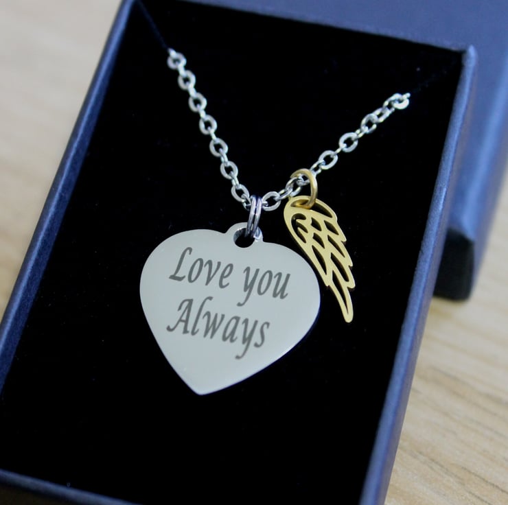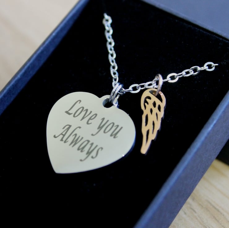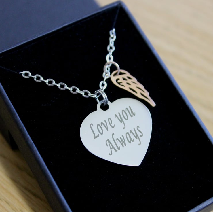 Please message me with the message you would like engraving.I can fit around 30 letters on each side of the heart. Please note your message will be engraved exactly as you have typed it, including upper/lower case letters.