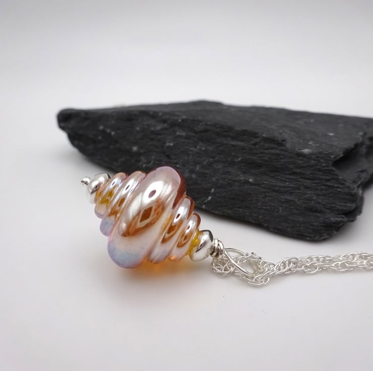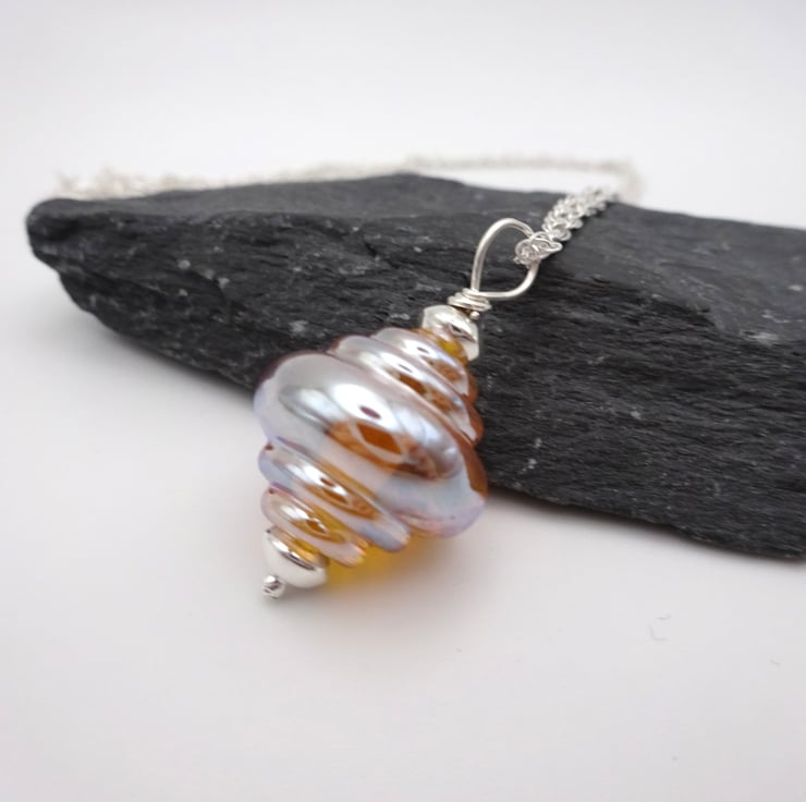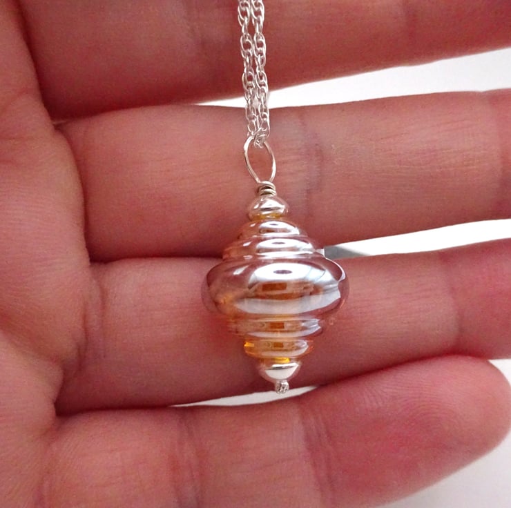 A handmade lampwork glass gold metallic pendant strung onto a sterling silver chain.