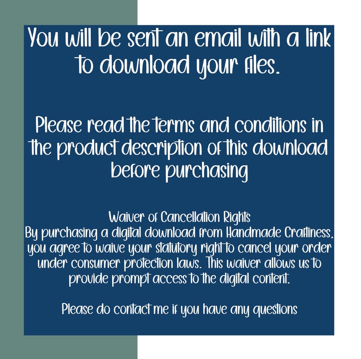 No Refunds for Digital Downloads Refund Policy for Digital Downloads Acceptance of Terms By completing your purchase, you acknowledge and accept this refund policy. At Handmade Craftiness, we are committed to providing high-quality digital products. Please read our refund policy carefully before making a purchase: Waiver of Cancellation Rights By purchasing a digital download from Handmade Craftiness, you agree to waive your statutory right to cancel your order under consumer protection laws. This waiver allows us to provide prompt access to the digital content. No Refunds After Download For digital downloads, consumers are required to waive their cancellation rights before the digital content can be provided. This means that once a customer (i.e., the consumer) has downloaded the content, they have given up their consumer rights to a refund. This policy aligns with consumer law for digital goods, ensuring the protection of intellectual property and preventing unauthorized distribution. Cancelling a Digital Download Under the Consumer Contracts Regulations 2013, digital downloads are neither goods nor services, meaning the law is a little different. If you want to download something within 14 days of buying it (known as the 'cooling-off’ period), you must give your consent to waive the 14-day cooling-off period. If you do not give your consent, the 14-day cooling-off period still applies. However, you will not be able to download your digital content until this period has ended. This policy exists to prevent customers from changing their minds after downloading the content. As you are being sent a link via email to download after purchase this will count as downloading the content as you will have access to download the files from the email. Eligibility for Refunds Refunds may only be issued under exceptional circumstances, such as: The digital content is proven to be defective or incomplete. An error on our part (e.g., duplicate billing). Contact Us If you believe you are eligible for a refund due to one of the exceptional circumstances above, please contact us at orders@handmadecraftiness.co.uk with your order details, a description of the issue, and proof of purchase. Our team will review your request and respond within 7 business days. For further inquiries, please contact us at orders@handmadecraftiness.co.uk. ------------------------------------------------------------------------------------------------------------------------------------------------------------- Ownership and Usage: All artwork within this shop is the exclusive property of Handmadecraftiness. You are expressly prohibited from reproducing, altering, redistributing, reselling, or claiming ownership of any digital item from this store. However, you are permitted to incorporate products from this store into your own physical handmade items for sale as a hobbyist. TERMS OF USE 1. You may print and use these items in a tangible journal/scrapbook/craft project etc. 2. You MAY NOT sell or share these files. 3. You MAY NOT reproduce/alter/redistribute our designs as a digital or physical item. 4. You MAY NOT sell or manipulate these files for resale purposes. 5. You MAY NOT share these files individually or as kits.