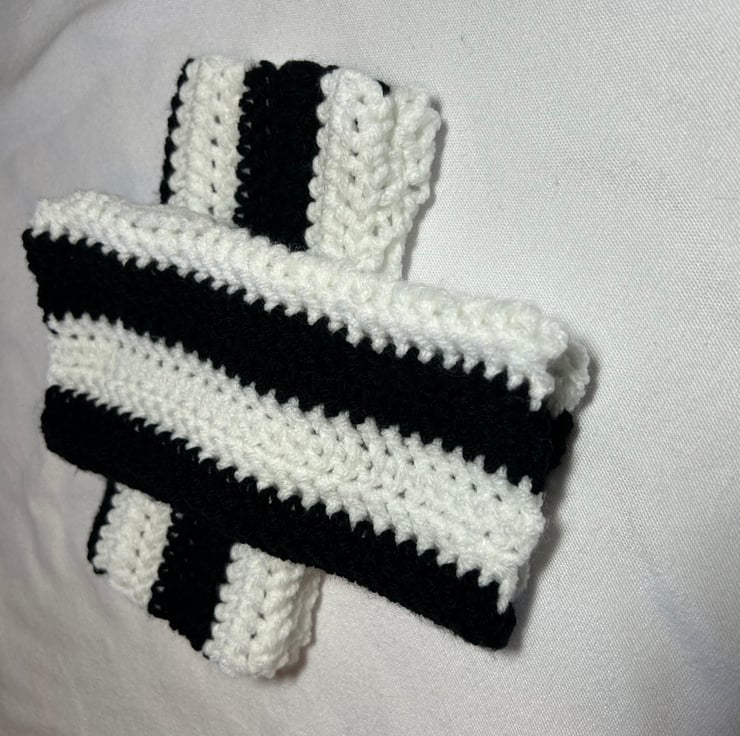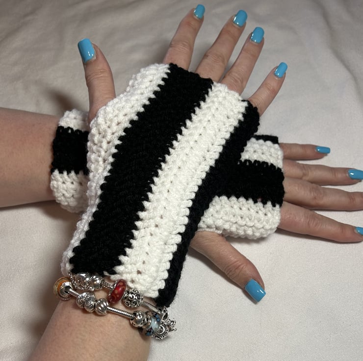 Handmade, crocheted, black and white gloves. Length 7", circumference 7" - will fit a teen/adult hand. These gloves will keep your hands warm, whilst still being able to get on with your day. They will pair with any outdoors outfit.