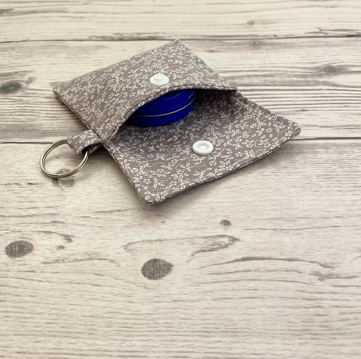 Grey ditsy floral cotton round lip balm keychain, lipstick holder.