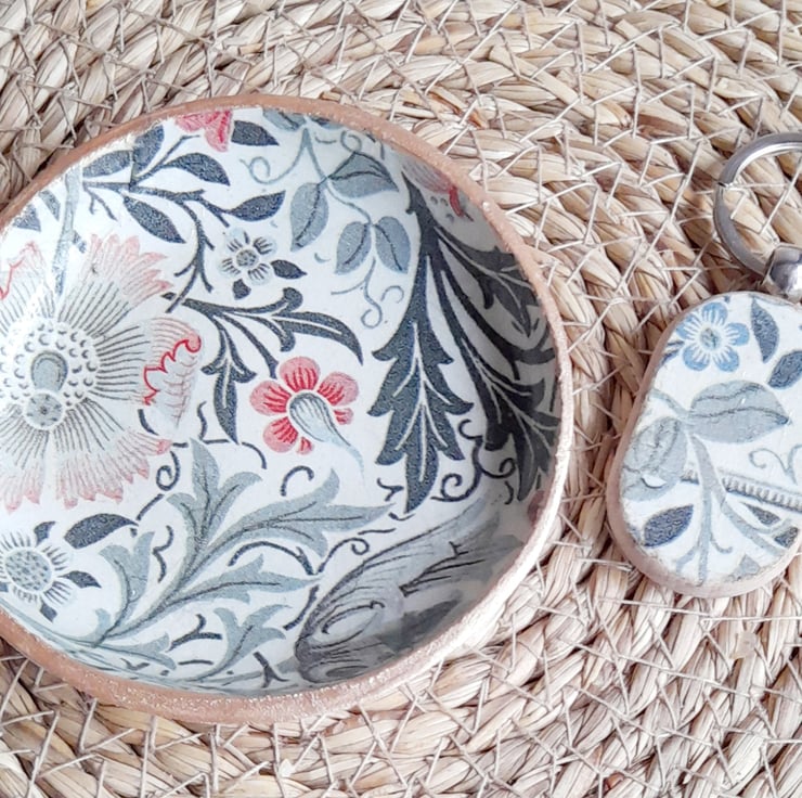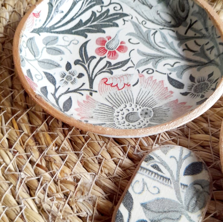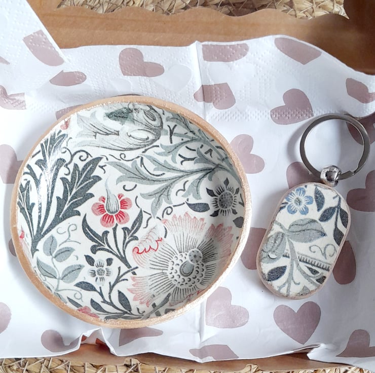 Decorated using Decoupage technique it features a beautiful William Morris floral design.