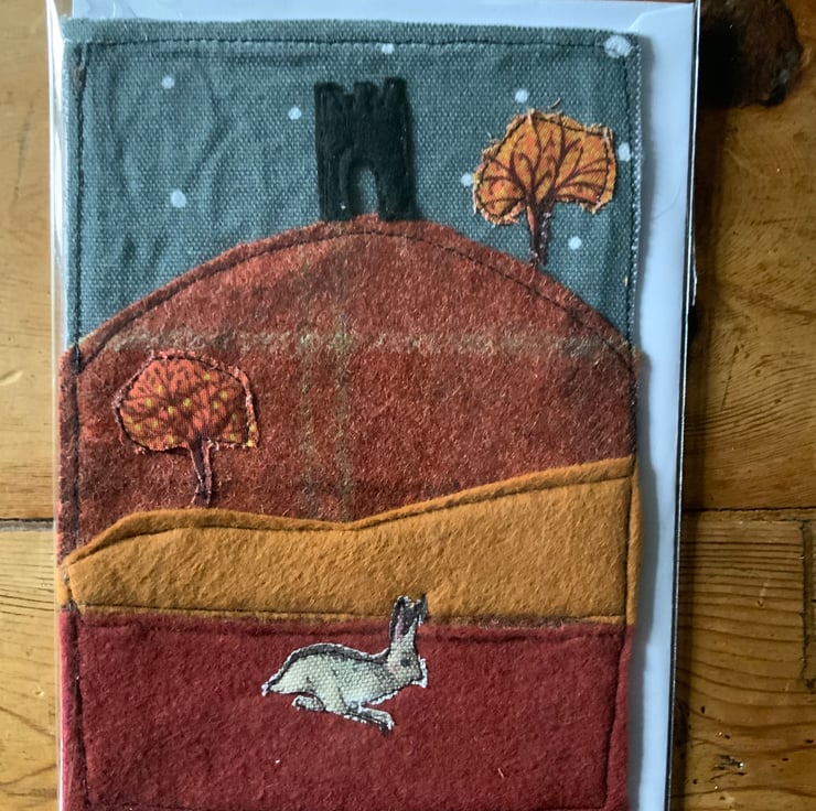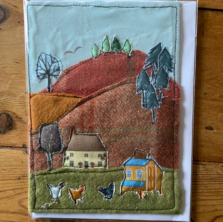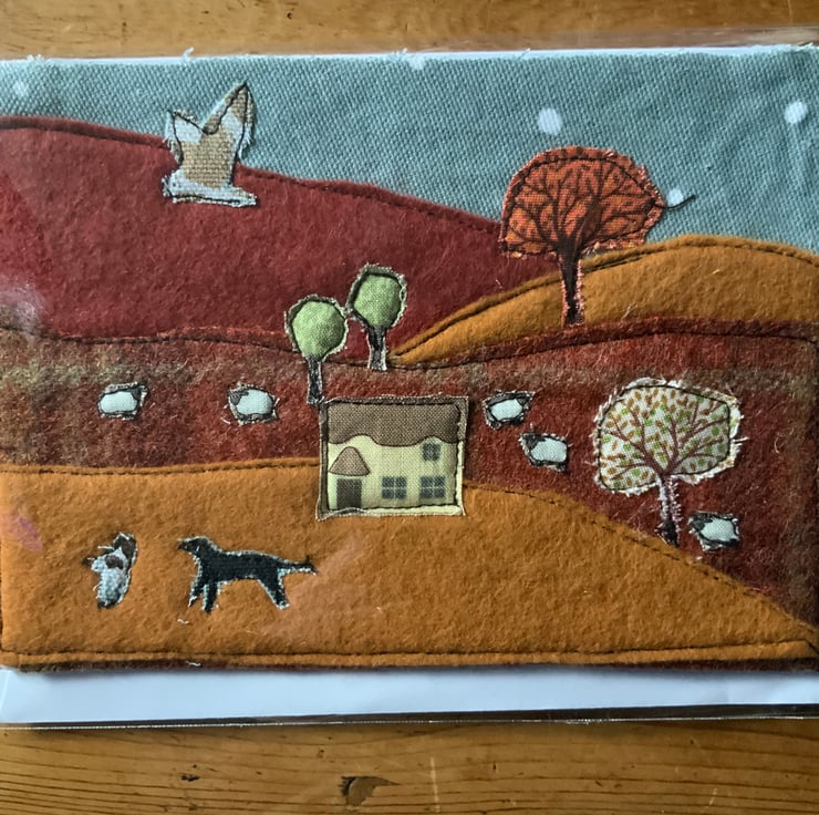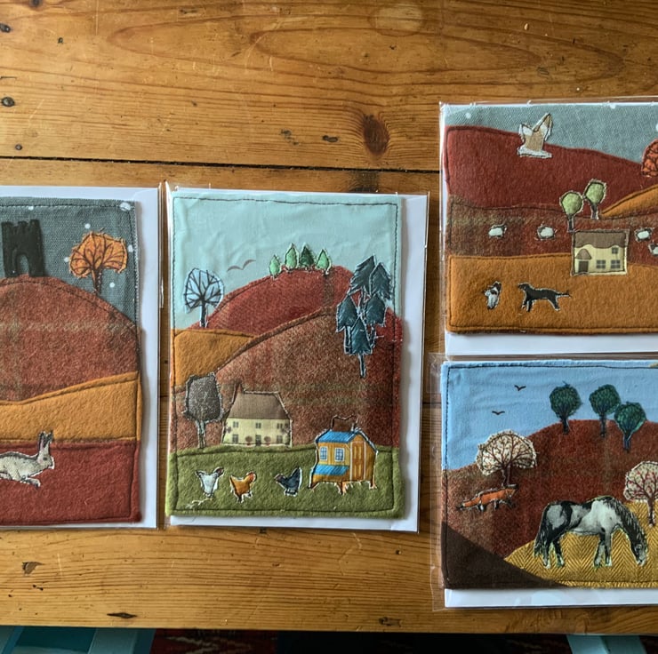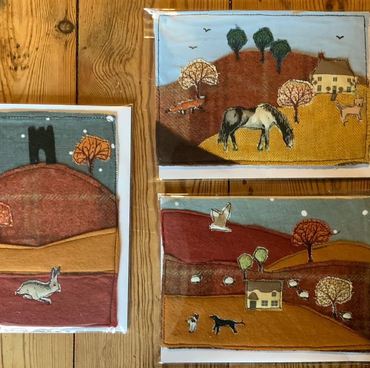 These gorgeous greeting cards are hand made using lovely rich tweeds with applique fabric scenes.