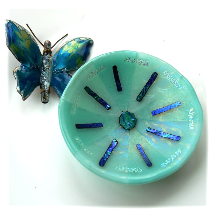 This is a fused glass bowl, twice fired to very high temperatures in my kiln, first to fuse all the glass together as a flat circle, 2nd to slump it over a little mold into a dish.