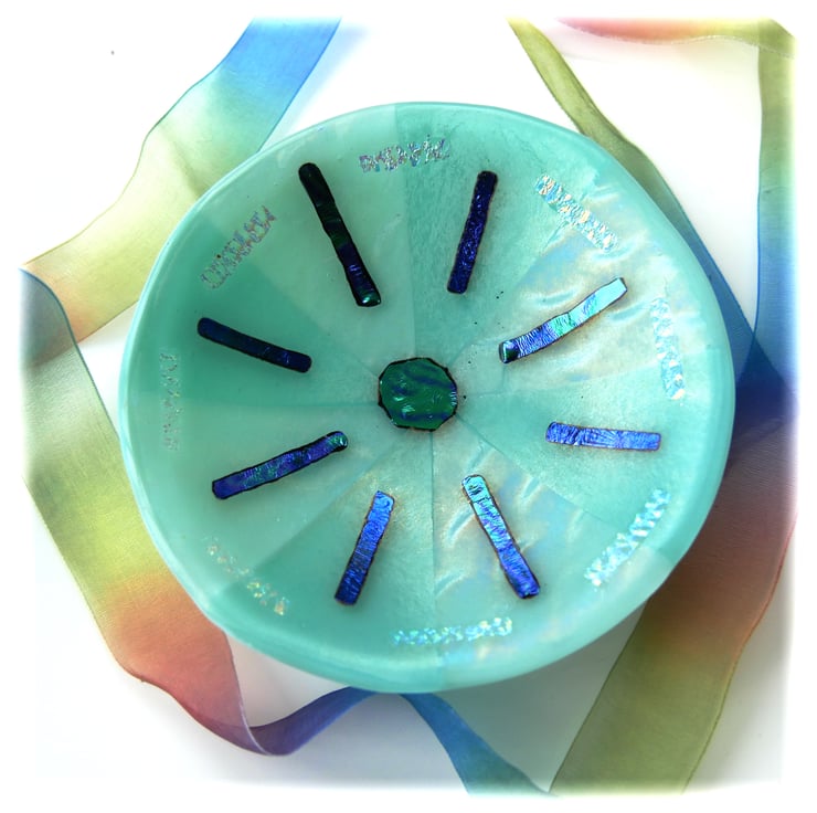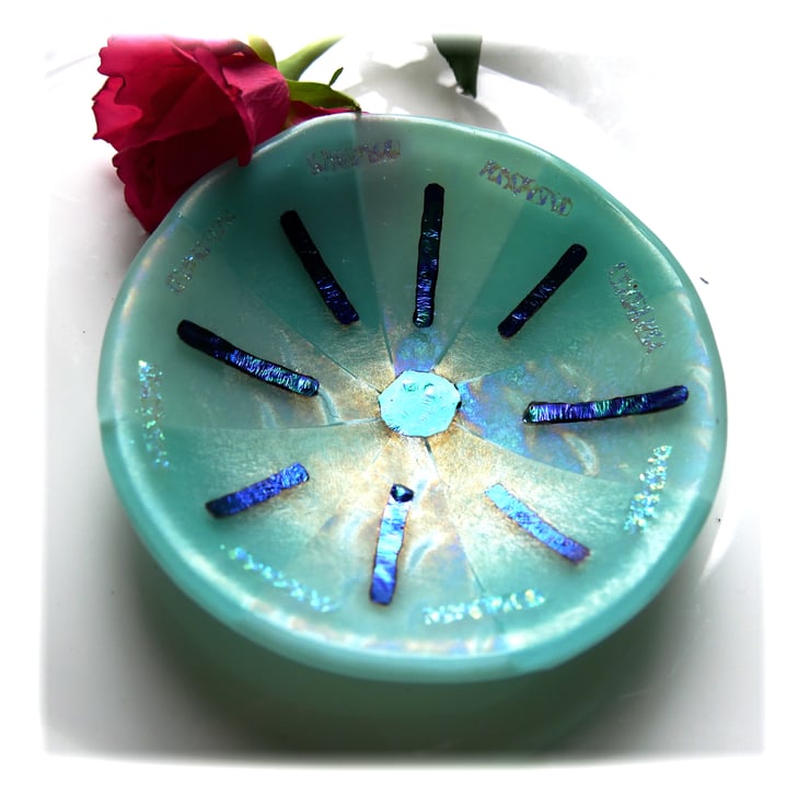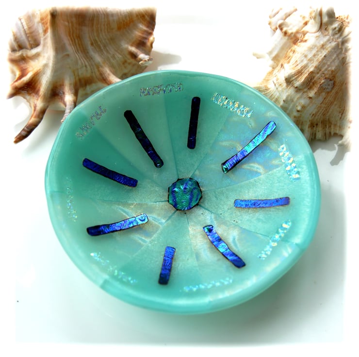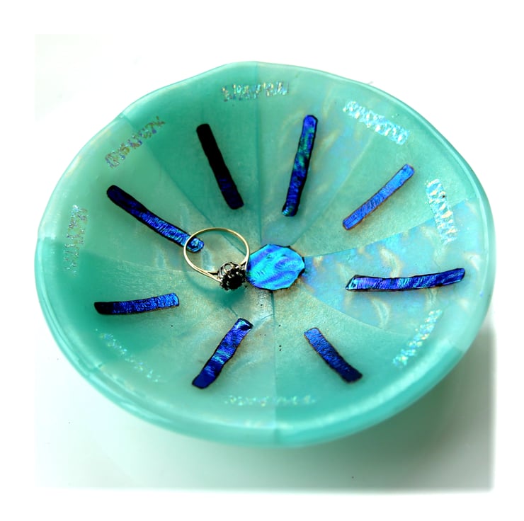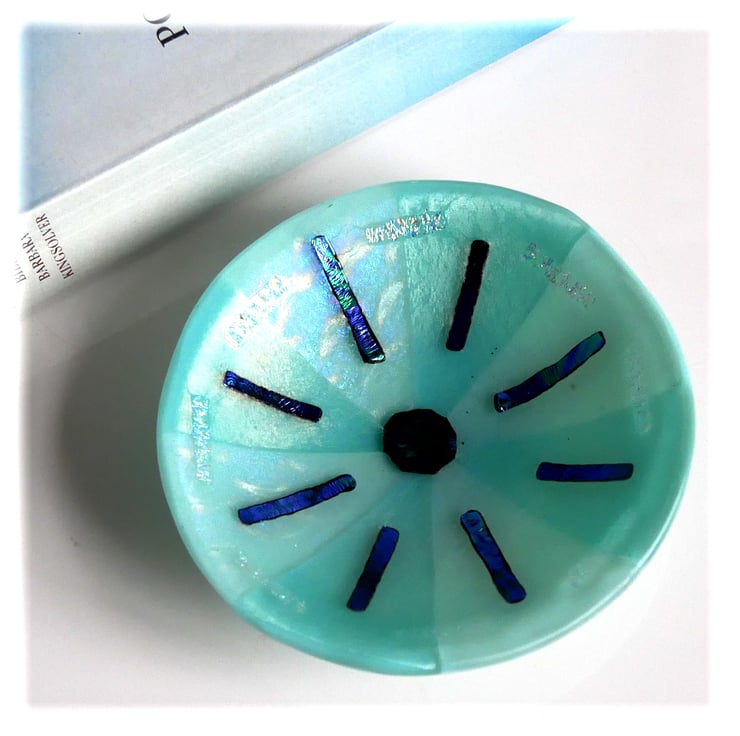 This round dish has a base of opaque Robin Egg Blue glass. I've topped it with alternate seqments of clear iridescent patterned glass and a very pale cyan glass.