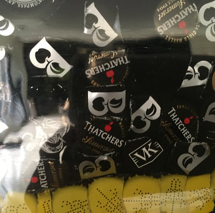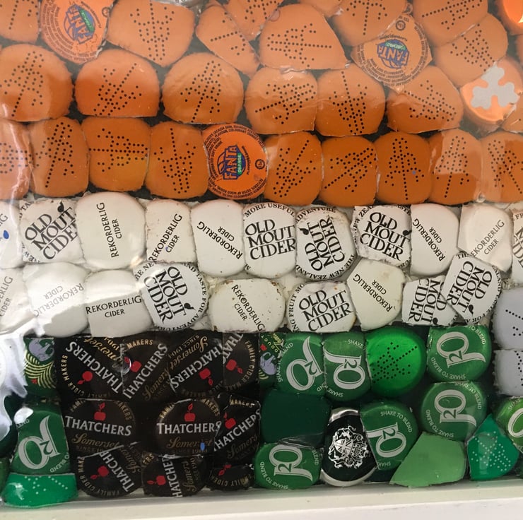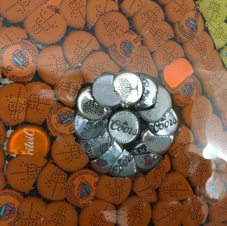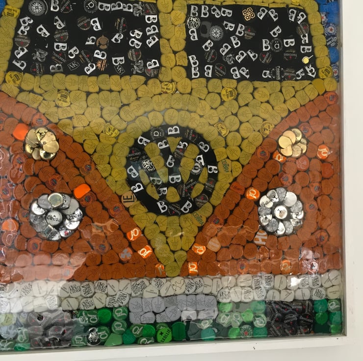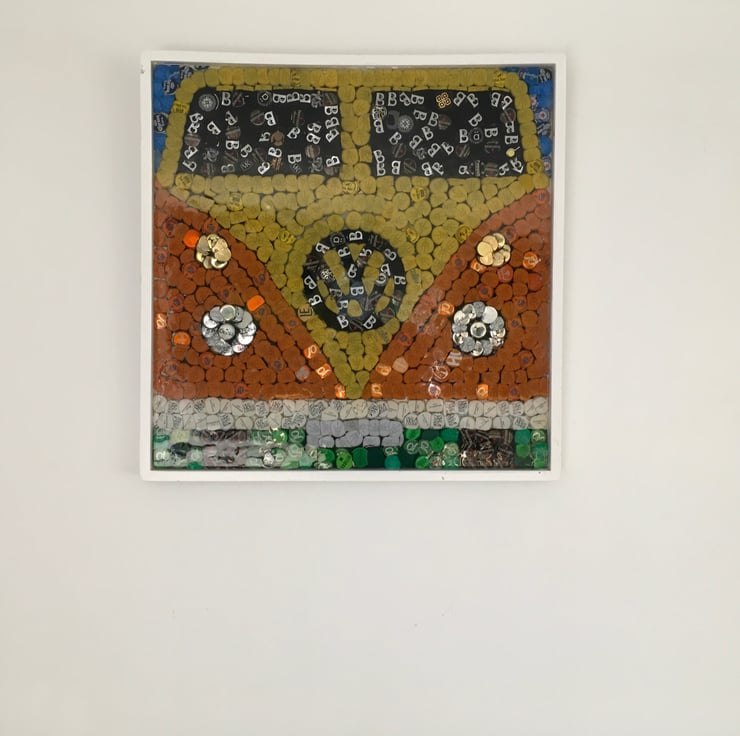 Vw camper van picture made from bottle tops and coated in resin comes with steel hanging cable attached