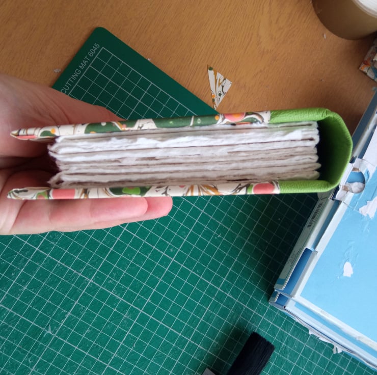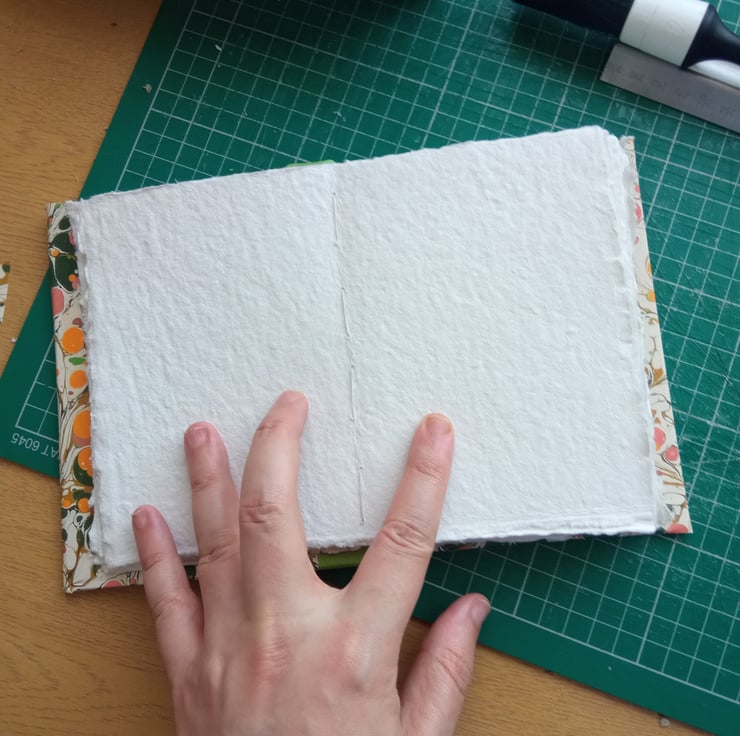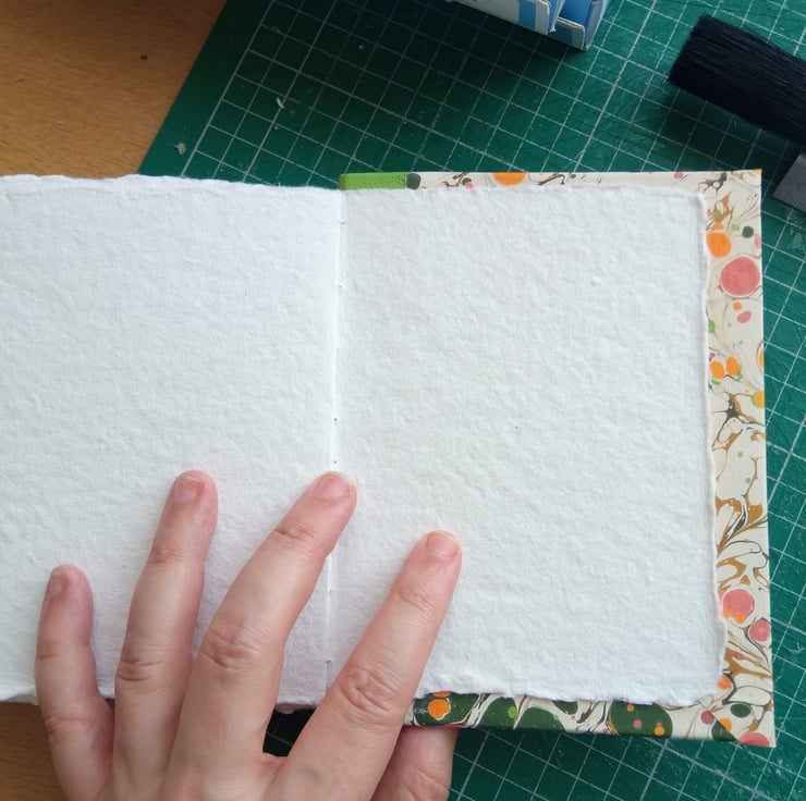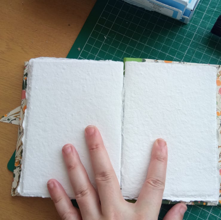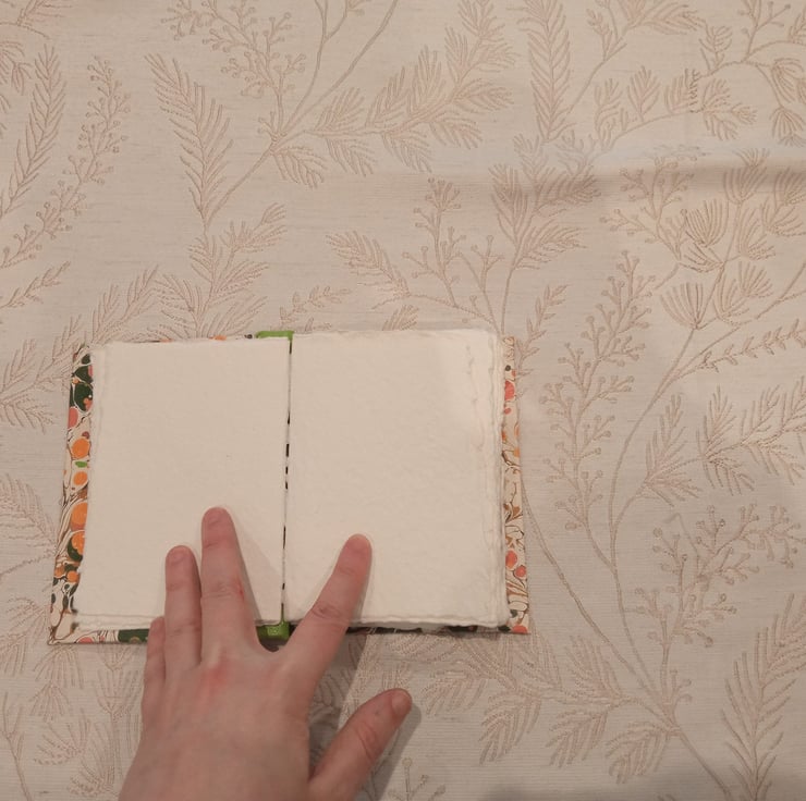 Cotton rag paper (approx 250 gsm, mid rough surface) hand torn to size, sewn with linen thread.
