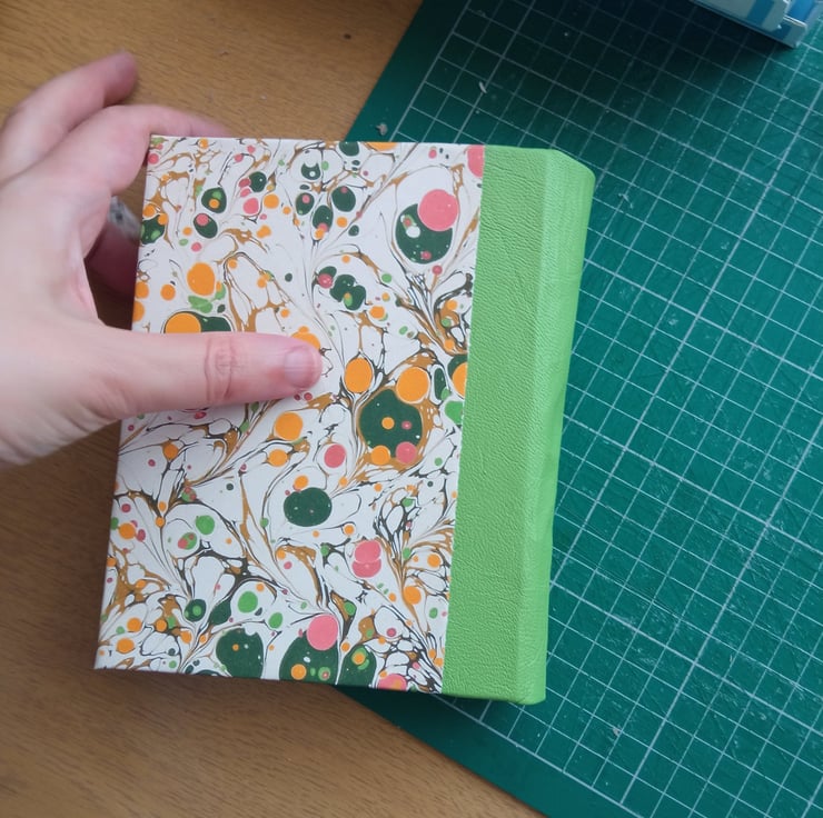 Spine lightly glued, leather spine, bookblock glued directly to cover so no endpapers as such.