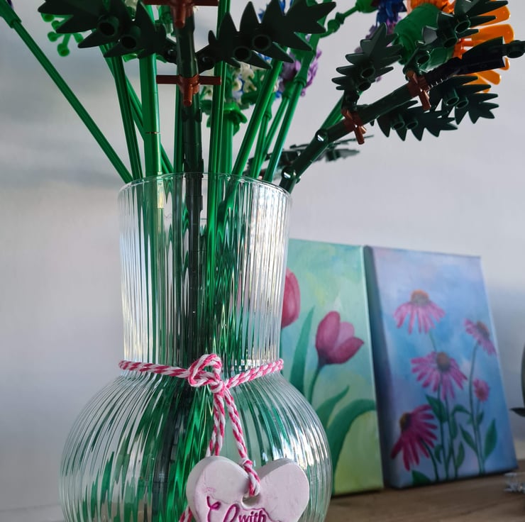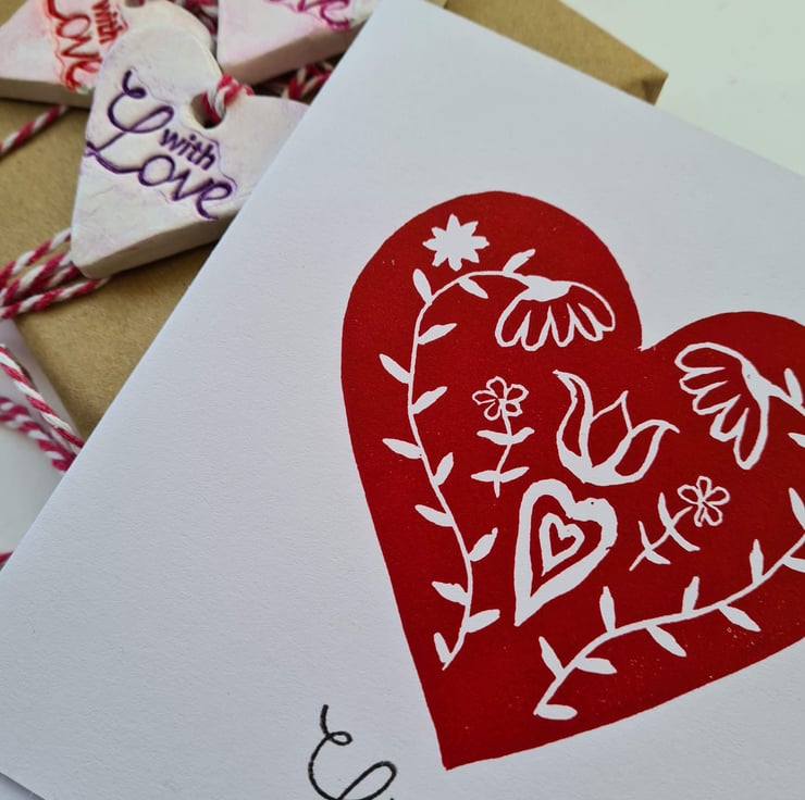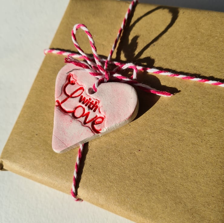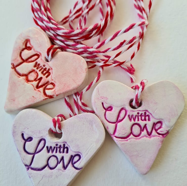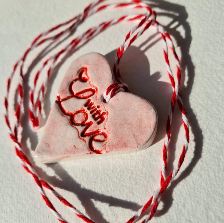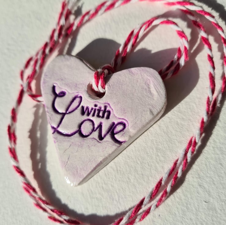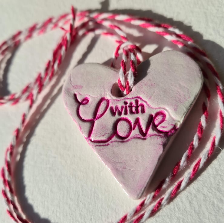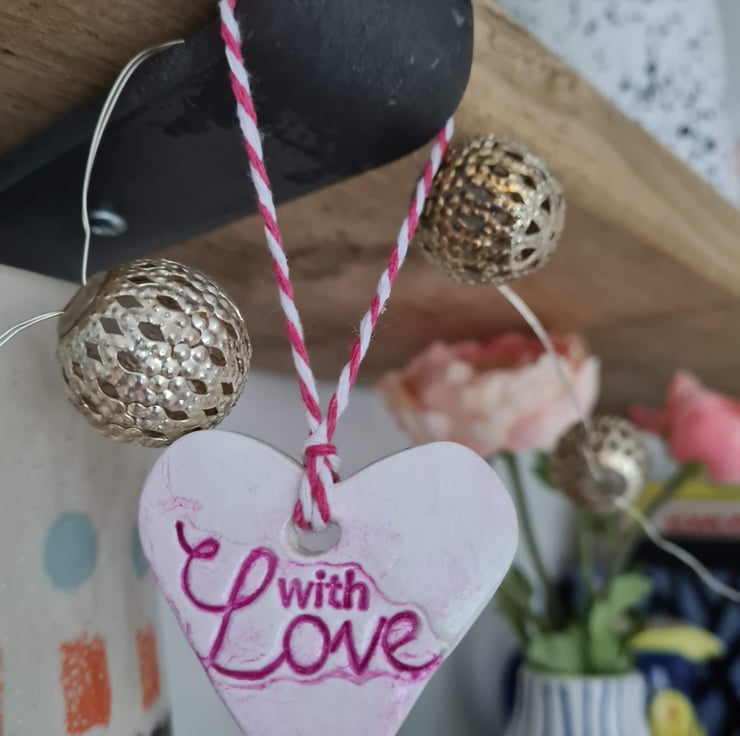 This pretty heart shaped hanging decoration is made from air-drying clay, which has been stamped with the words 'with love' and given a colour wash to highlight the wording (three colour choices). Once dry, I gave it three layers of gloss varnish to give it a glazed ceramic look then attached baker's twine to finish. See 'Valentine's Day cards' collection for matching cards (also see photos).