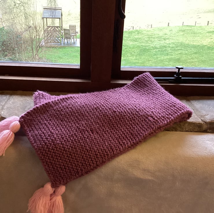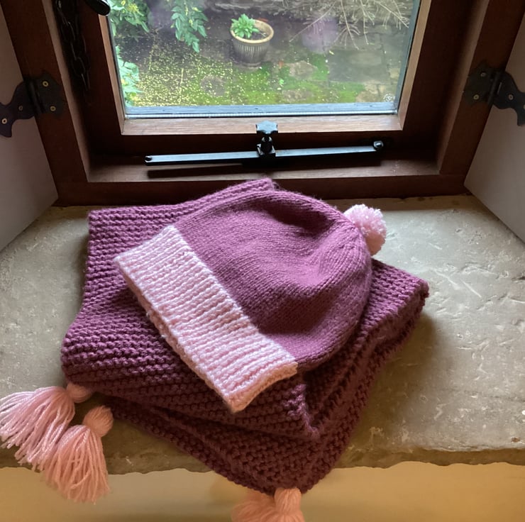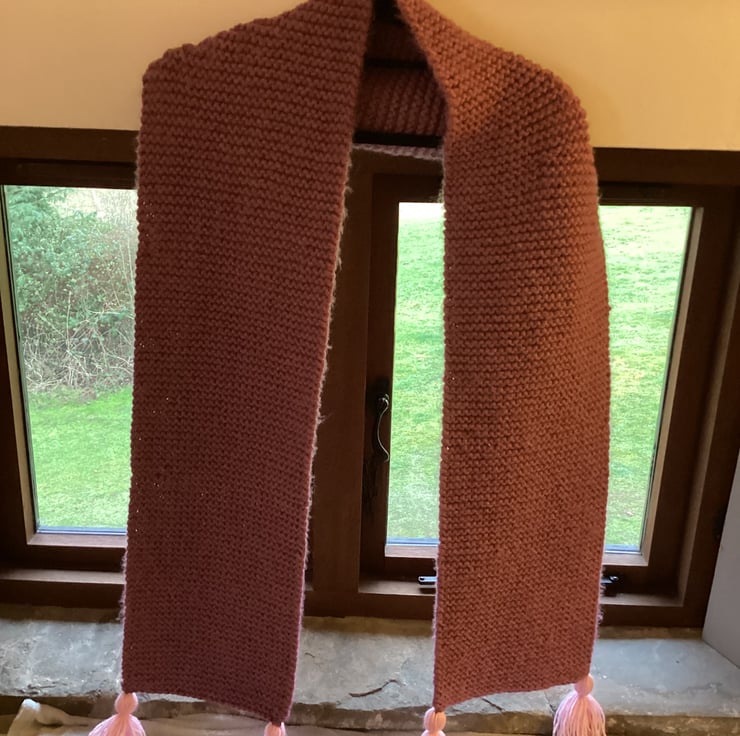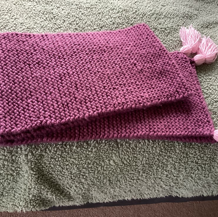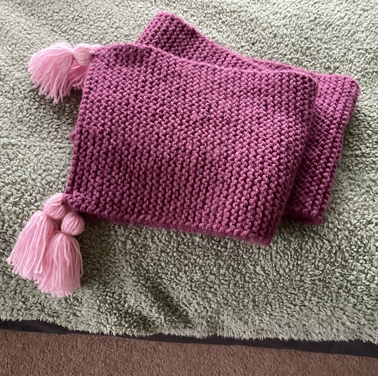 Hand made burgundy and pink scarf with pink tassels, 70 inches long plus tassels , thick and warm,I do have a matching hat. I would recommend hand wash and dry flat.