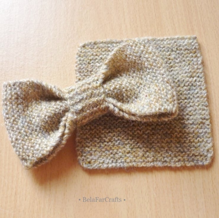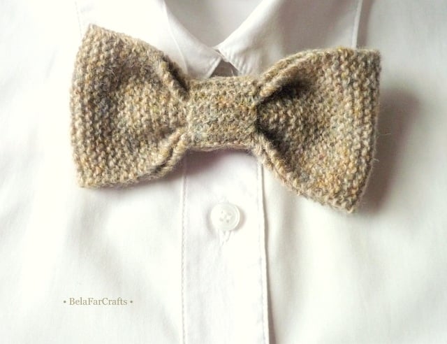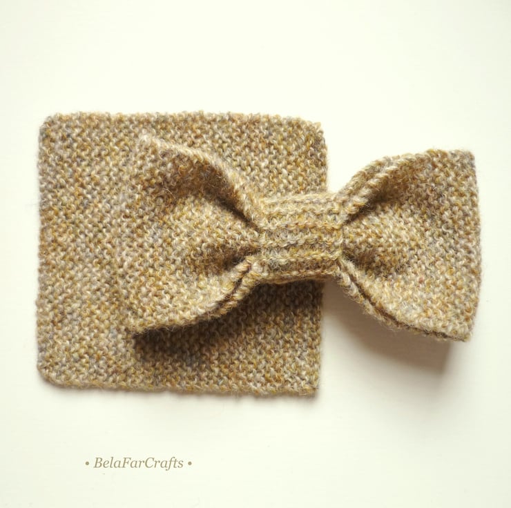 My hand knitted bow & pocket square are made of Shetland sheep wool, produced and spun in Scotland. It is a very fine yarn that blends subtle earthy shades of beige, yellow, brown and grey.