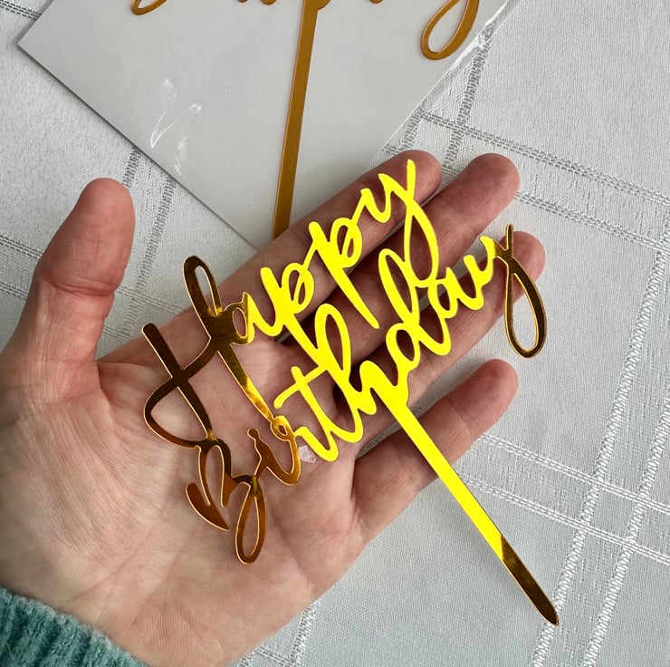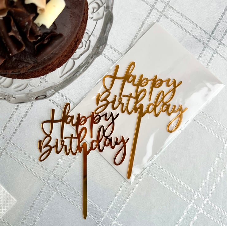 Make your celebration sparkle with this metallic gold acrylic “Happy Birthday” cake topper.