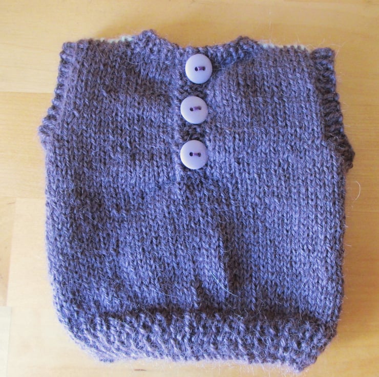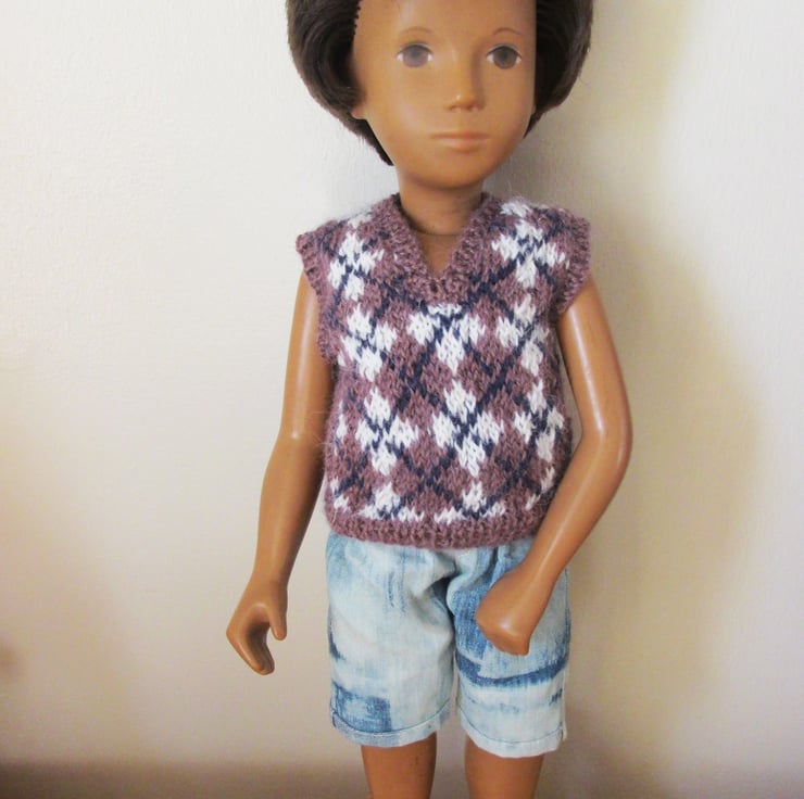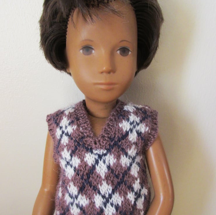 Hand knitted tank top/vest for a 16" Sasha doll. Fastens with 3 buttons at the back so it is easy to put on and off the doll. Argyle pattern in a soft plum alpaca wool. Hard to find this item anywhere else.