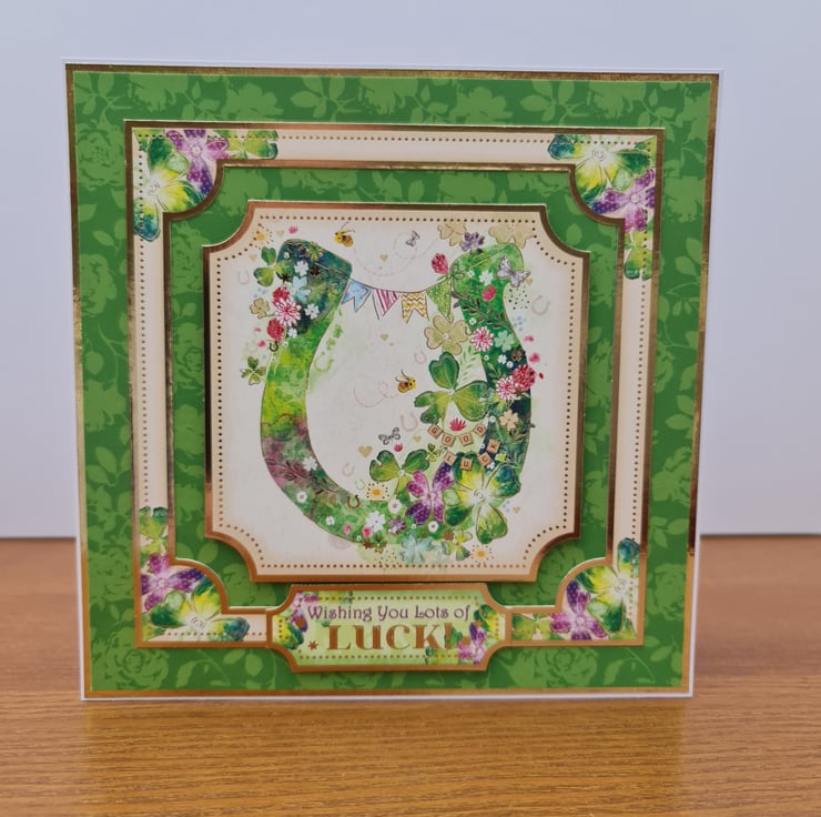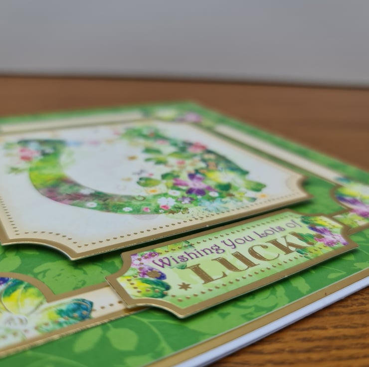 The card is made with a lovely green floral design. The topper features a horseshoe and clover, and the sentiment reads, 'Wishing you lots of luck'.