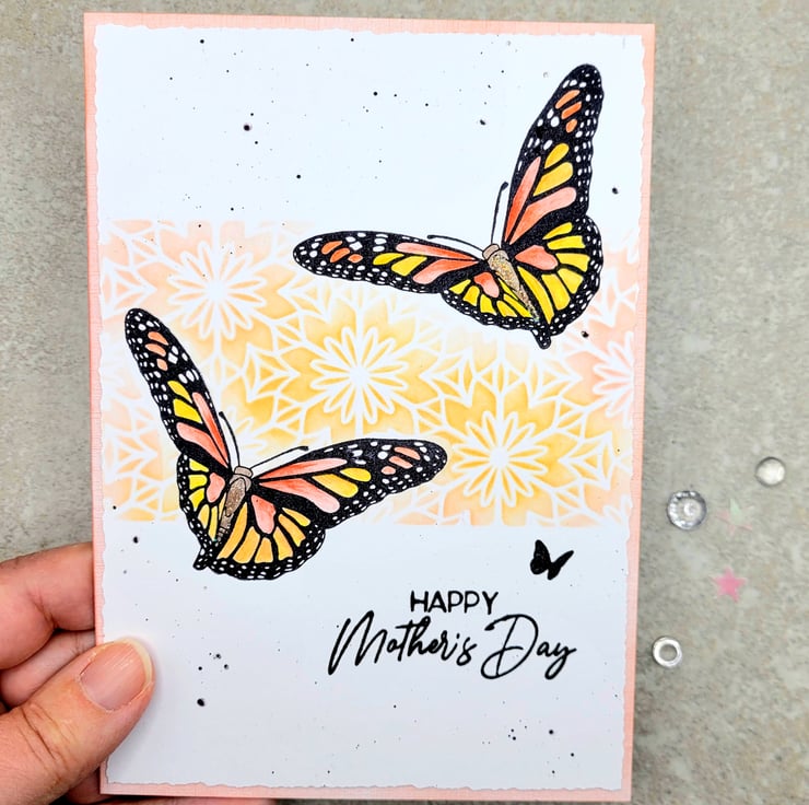 A happy mother's day card with a clean and fresh design. An individually handmade card with a letterpress style design of two beautiful butterflies that I've pressed into the card with archival black ink and then watercoloured with watercolour pencils and brushes. There is a stencilled abstract floral background, created by hand with co-ordinating ink colours. Perfect for sending your Mum a unique and beautifully textured special card. It comes supplied with a 100% recycled brown kraft paper envelope.