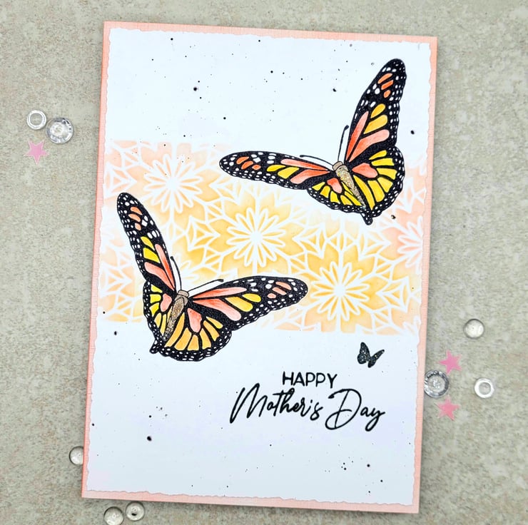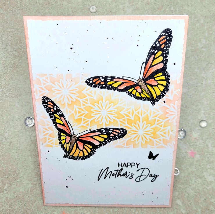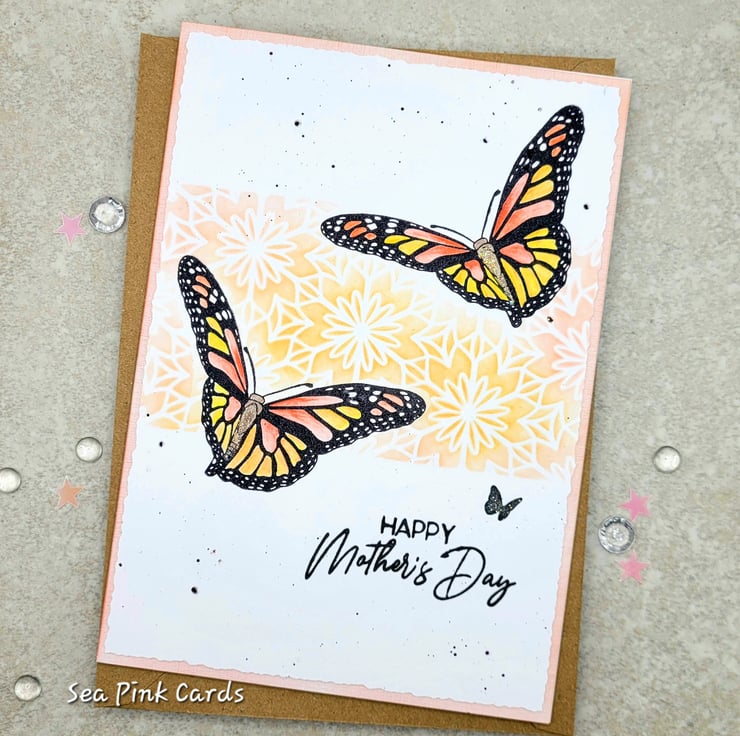 A happy mother's day card with a clean and fresh design. An individually handmade card with a letterpress style design of two beautiful butterflies that I've pressed into the card with archival black ink and then watercoloured with watercolour pencils and brushes. There is a stencilled abstract floral background, created by hand with co-ordinating ink colours. Perfect for sending your Mum a unique and beautifully textured special card. It comes supplied with a 100% recycled brown kraft paper envelope.