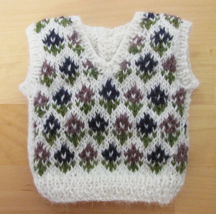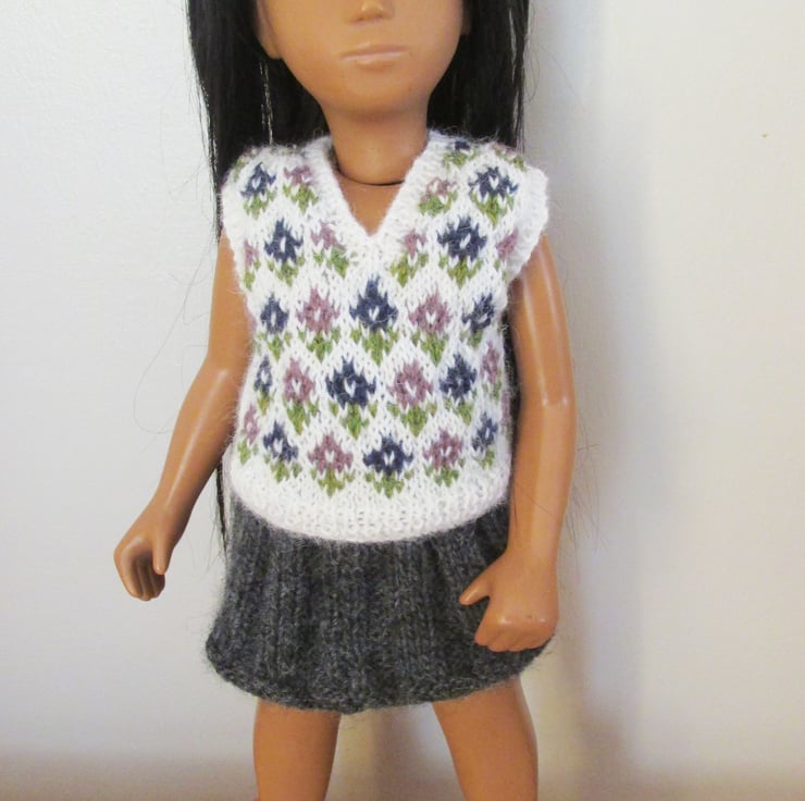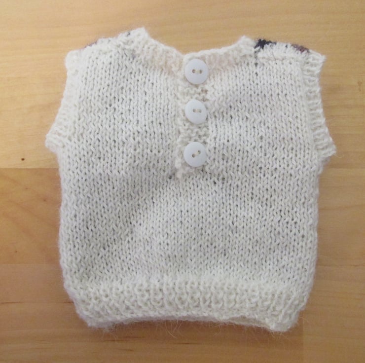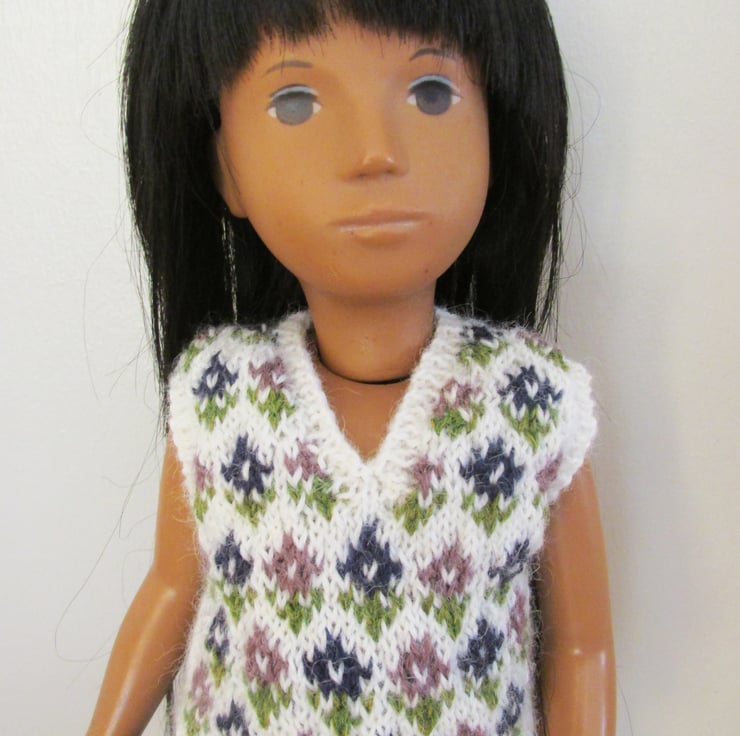 Hand knitted sleeveless sweater for a Sasha or Gregor doll. Fastens with 3 buttons at the back to make it easy to put on and off the doll. Knitted in a soft alpaca yarn in a white/navy/plum colourway. Hard to find items.