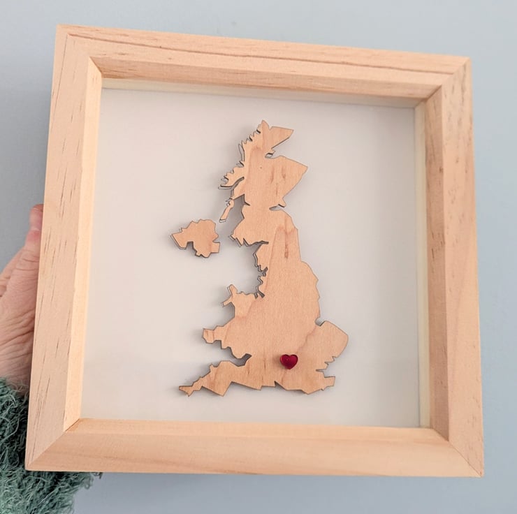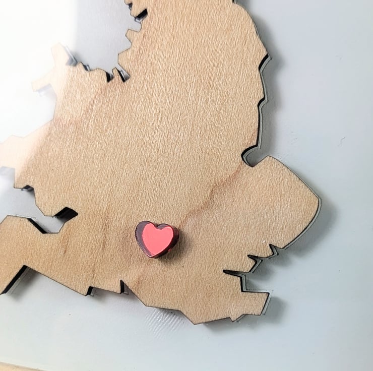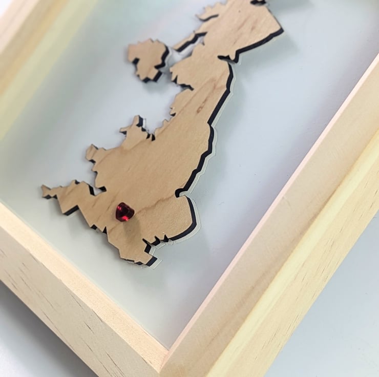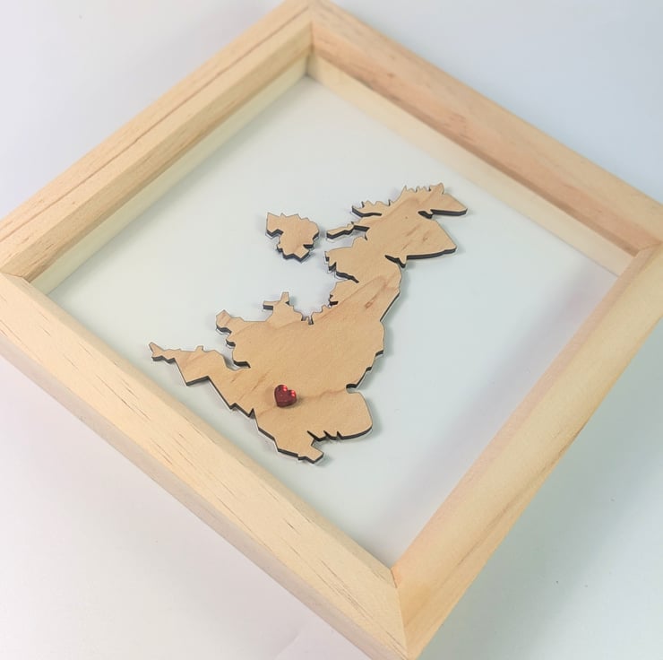 This article is a quality-finished, laser-cut, handpainted UK map with a small heart on the desired city. The map is made of wood, the base is hand-painted on white and the heart is laser-cut acrylic piece and glued. The front of the frame is glass. The heart can be personalized to a special location where your journey together began.