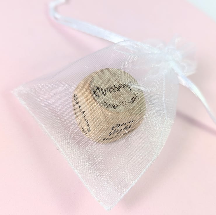 The dice measures 2.5cm x 2.5cm (0.98in) and includes a white organza bag.