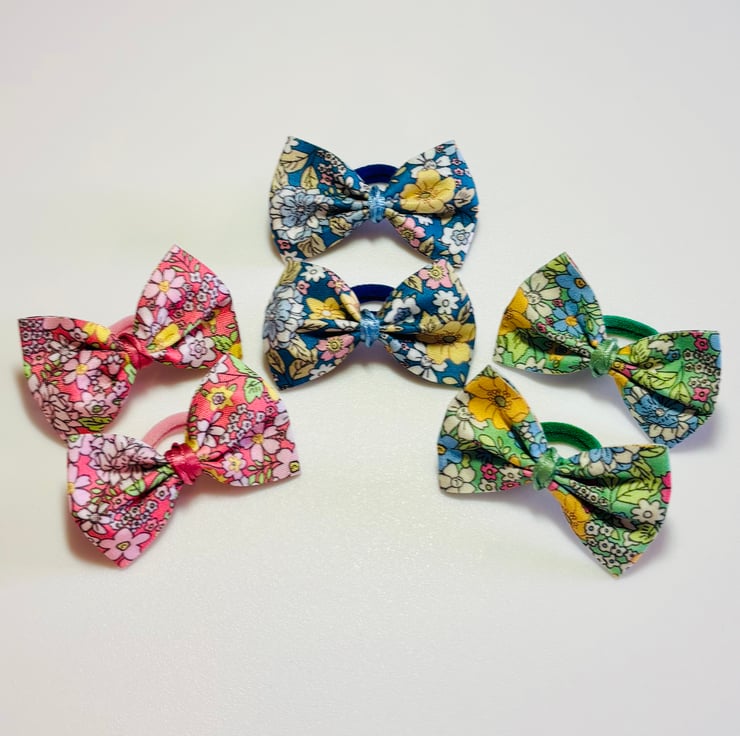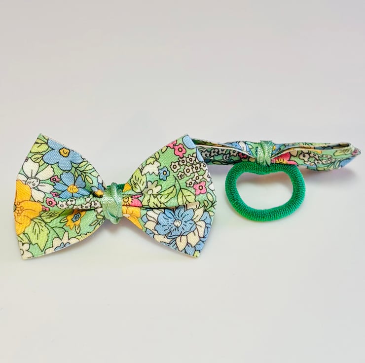 Handmade beautiful spring floral ribbon bows with green being the dominant colour alongside yellow, Pink, Blue and White. Set on Green mini bands for a soft comfortable hold.