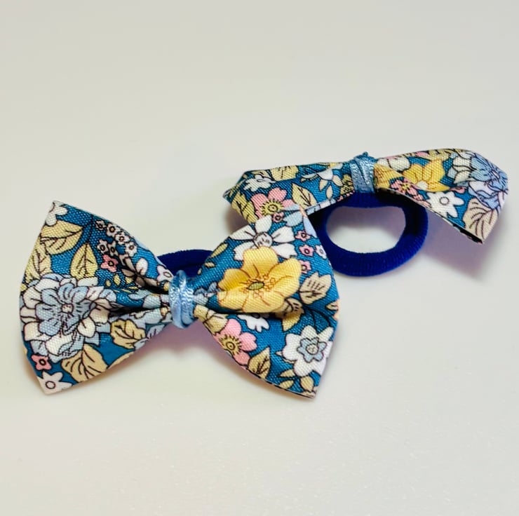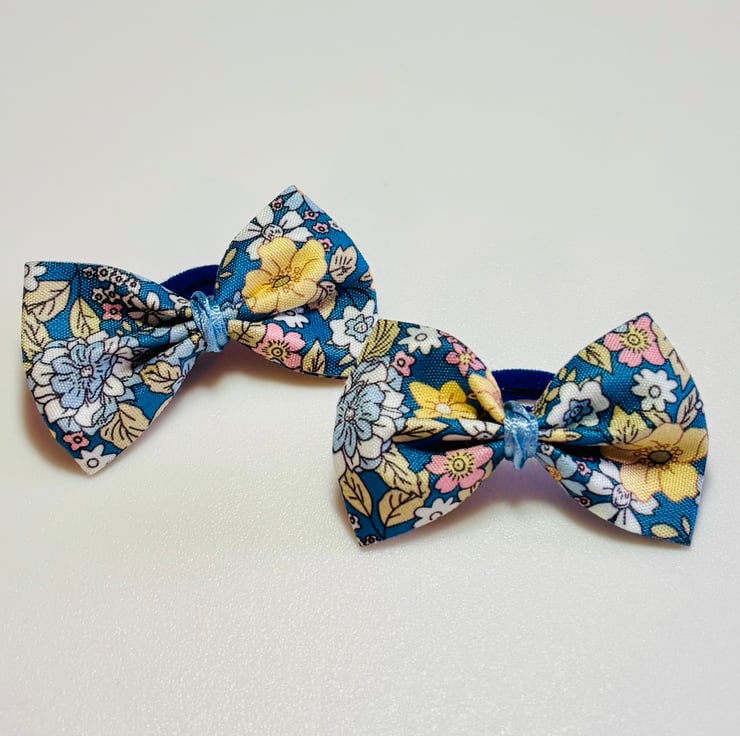 Handmade beautiful spring floral ribbon bows with Blue being the dominant colour alongside yellow, Pink, and White. Set on Blue mini bands for a soft comfortable hold.