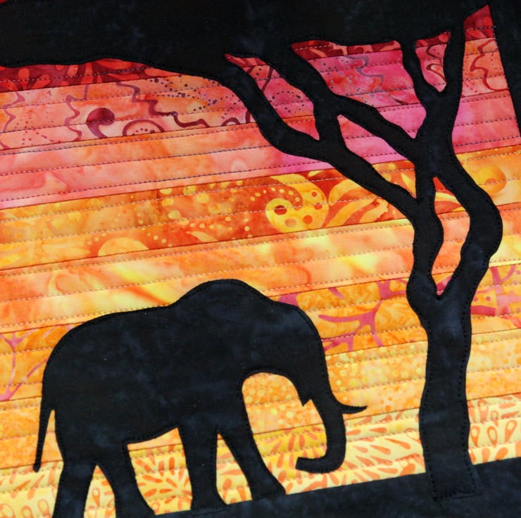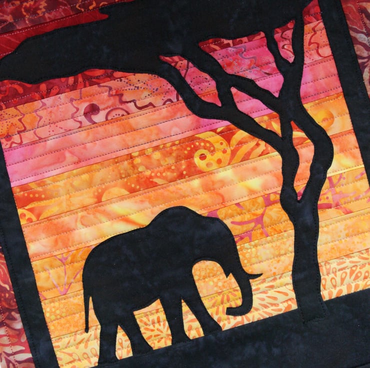 A beautiful sunset of orange and red batiks makes the perfect backdrop for the silhouette of a lone elephant.