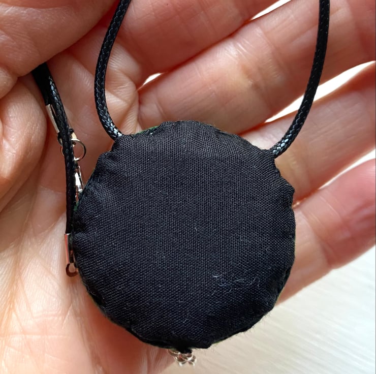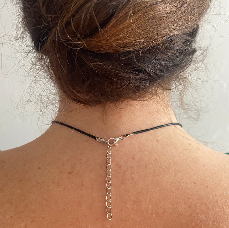 The pendant is 1.5 inch and hangs on a 17inch adjustable fastening cord.