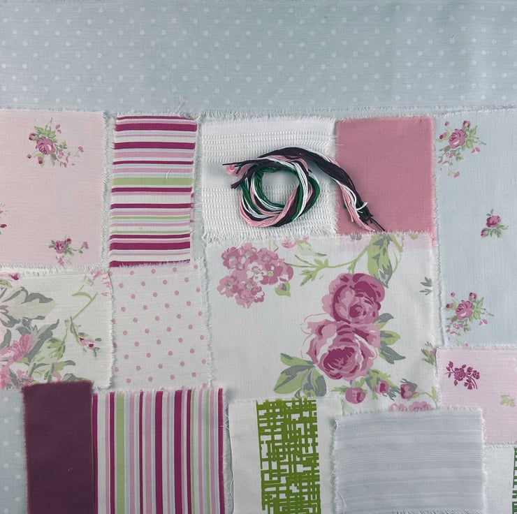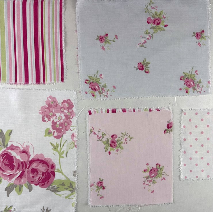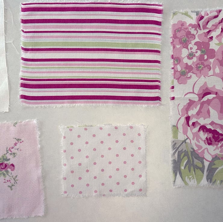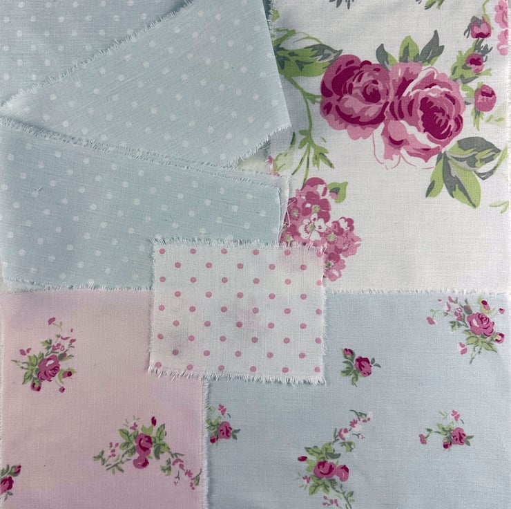 A selection of coordinating fabric pieces (florals, stripes, and textures)