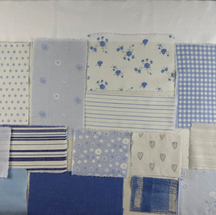 A selection of coordinating fabric pieces (florals, stripes, gingham, and textures)