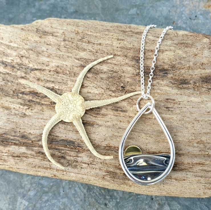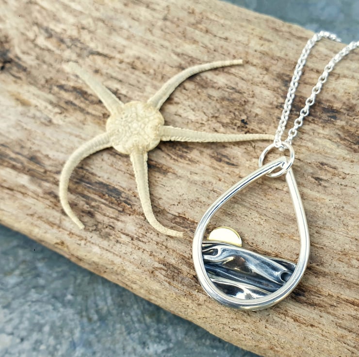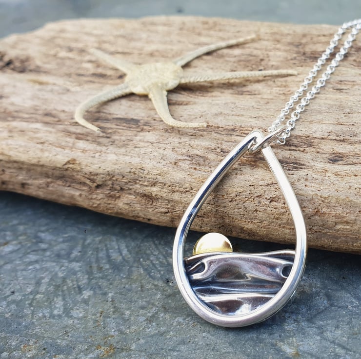 This pendant is perfect for anyone who loves the coast. The sterling silver teardrop has been formed from 2mm wire and it has a layer of fine silver which has been folded to create the wave like texture with a brass sun. It measures approx 35mm long and 23mm across and hangs from a sterling silver belcher chain which fastens with a bolt clasp.