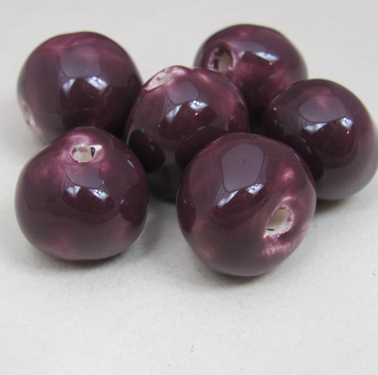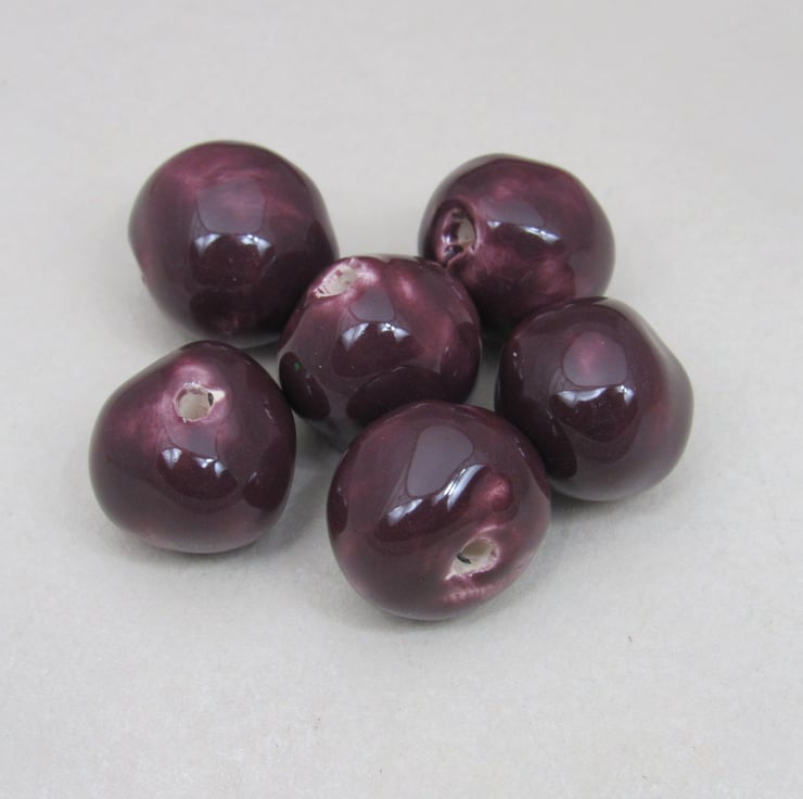 A mixture of handrolled ceramic beads, finished with a dark aubergine purple glaze.