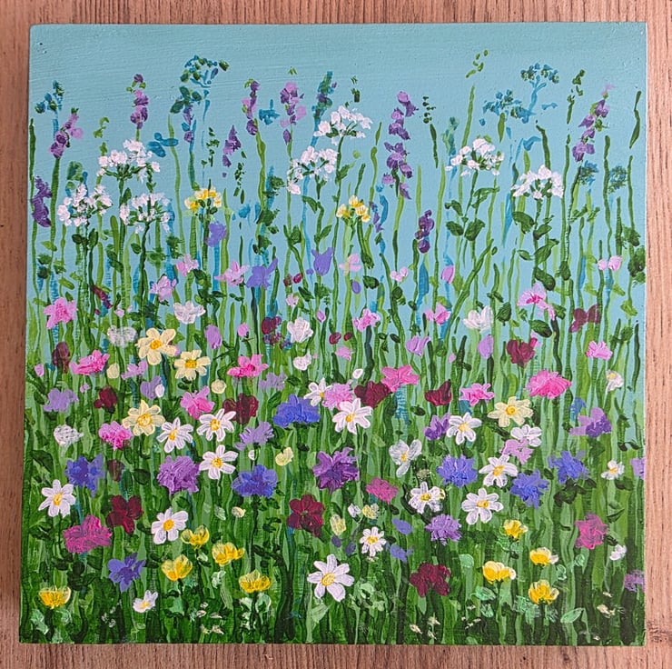 'Meadow Song' is an original acrylic painting on a wooden box frame. It features a meadow scene with flowers such as cornflowers, daisies and buttercups.