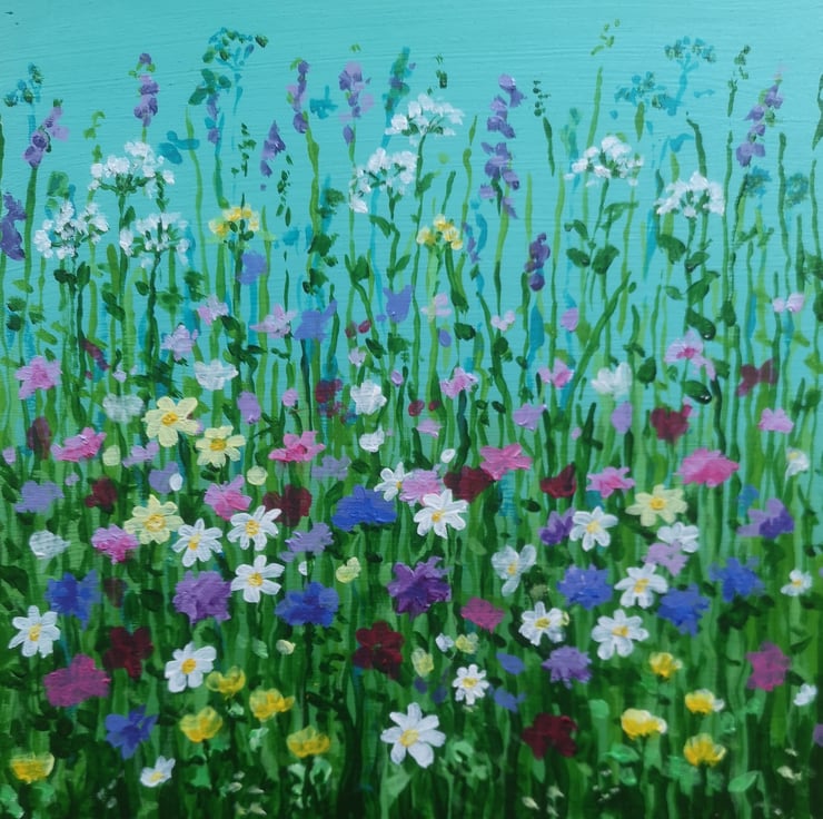 'Meadow Song' is an original acrylic painting on a wooden box frame. It features a meadow scene with flowers such as cornflowers, daisies and buttercups.