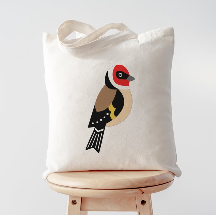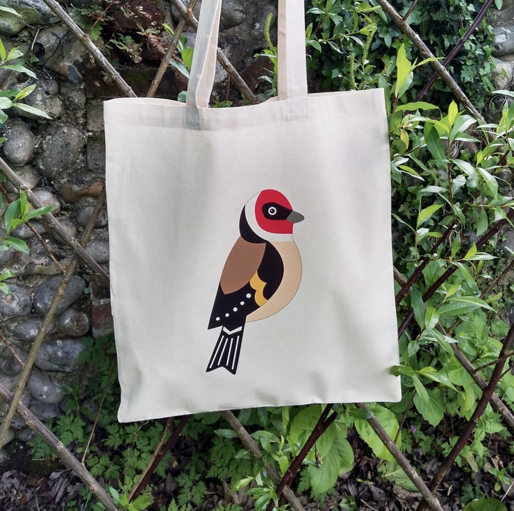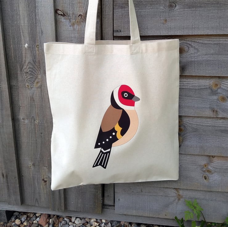 Natural cotton tote bag featuring my fun, colourful goldfinch design, which is printed on one side.