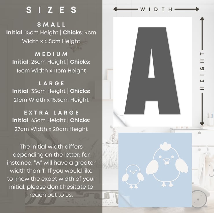 Add a touch of fun and personality to your child's space with our Personalised Initial Wall Sticker featuring a playful chicks design. Perfect for nurseries, bedrooms, or playrooms, this high-quality vinyl decal offers a charming and customisable solution to brighten up any wall.