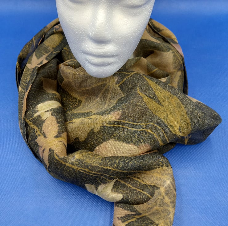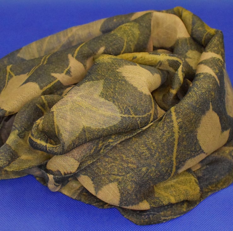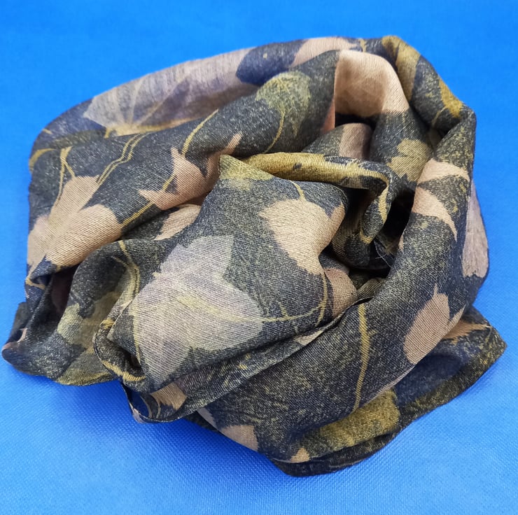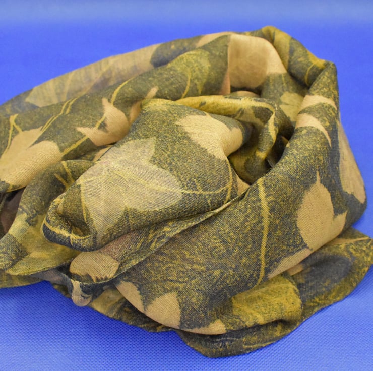 This scarf has been botanically printed using natural dyes and leaves to create a unique piece of clothing suitable for all occasions. The base fabric is a light, gauzy blend of 50% wool and 50% silk that has been dyed with gorse flower and iron before being scattered with leaves gathered from the woods and parks of North Yorkshire. A dye blanket of logwood has then been applied before the whole piece has been steamed to seal the imprint of the leaf within the fabric and allow the dyes to blend together. A hand sewn hem has then completed the scarf which measures 30cm x 215cm.