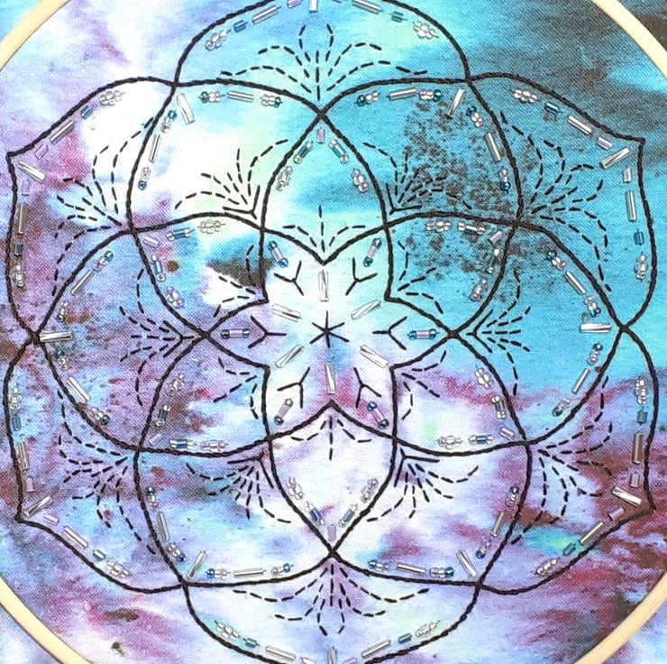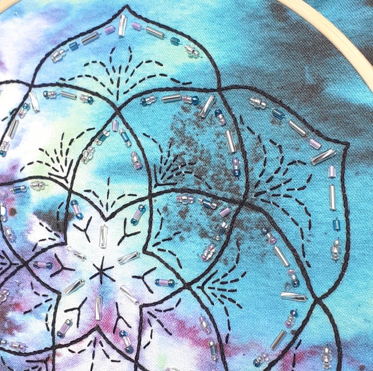 The design is digitally printed on to 100% cotton. 33cm / 13 inch square with the design printed as a square so it could be made in to a cushion or mounted in a 20cm / 8 inch hoop.