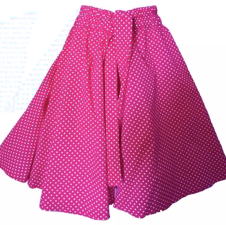 Handmade in Wales 1950s Vintage retro rockabilly full circle skirt, elasticated waist This skirt is made in a polycotton 4mm polka dot print in bright pink. It will fit multi sizes dues to the elasticated waist. 28" Long from top of waistband