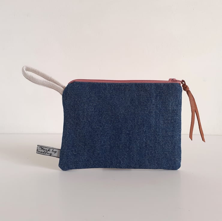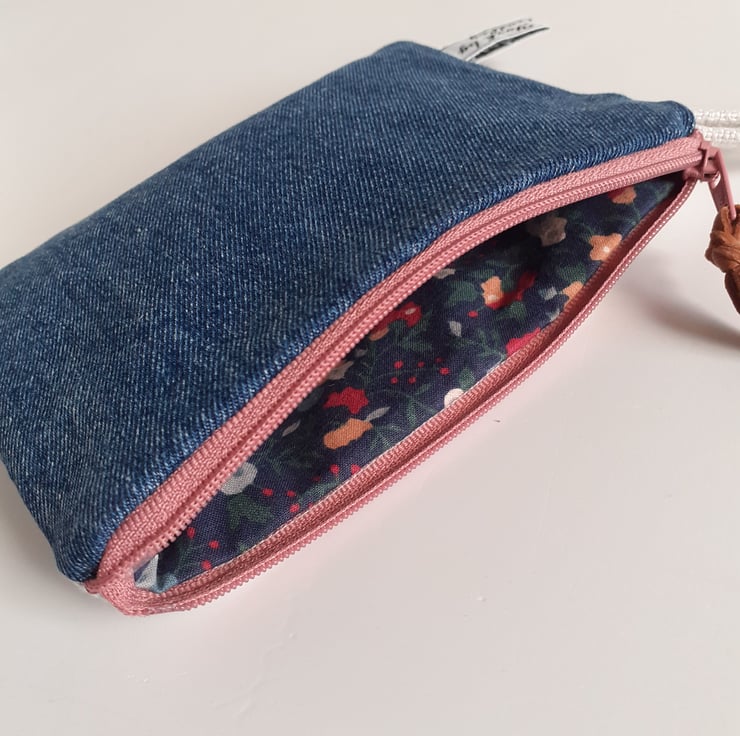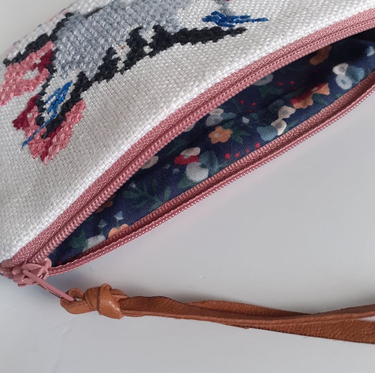 The lining is made from a floral vintage print, and there is a dusty pink zip opening measuring 16 cm with a recycled soft leather pull.