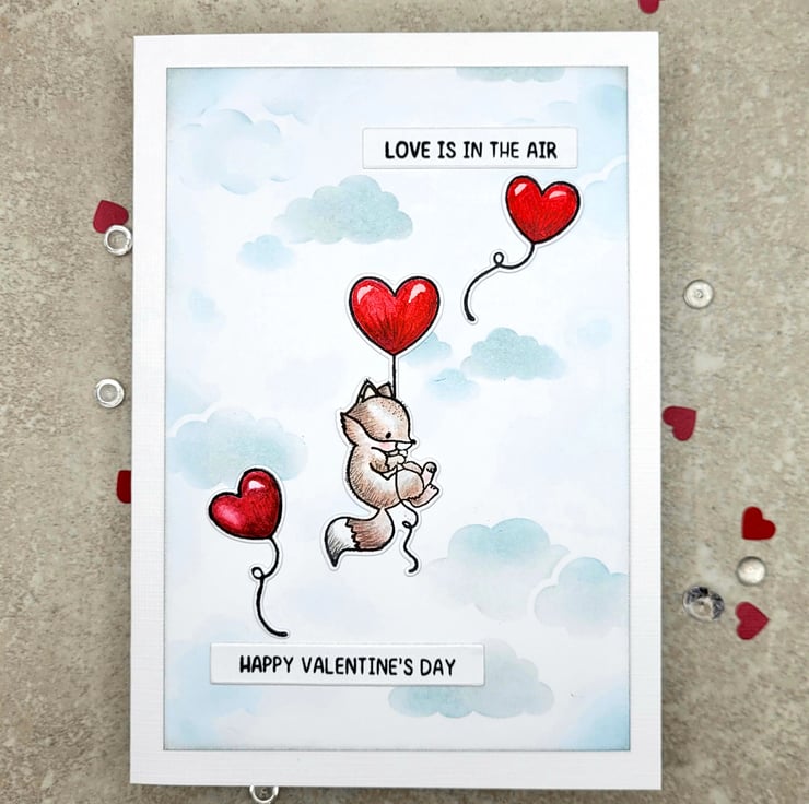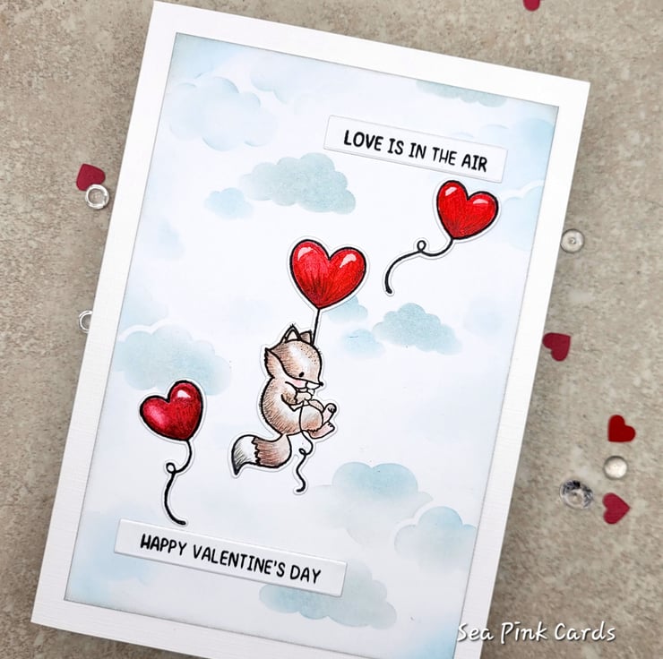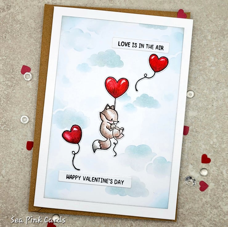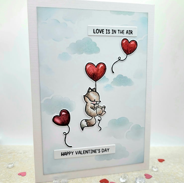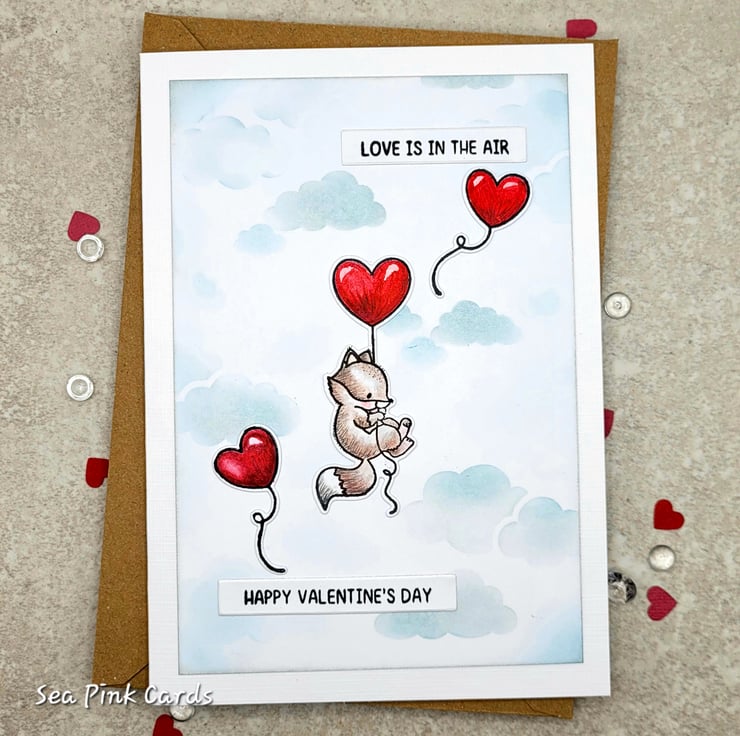 A valentine card with an adorable fox floating in the sky, with a trio of cherry red heart shaped balloons! This individually designed and handmade card measures 12.5 x 17.5 cms and will be supplied with a 100% recycled brown kraft paper envelope. I stamped the fox and balloons with black archival ink and then watercoloured them. The cloudy sky background has been stencilled by hand using pearlised silver ink and pale blue ink. You will see subtle soft shimmer when the card catches the light. There are two stamped sentiments reading, love is in the air and happy valentine's day in a simple, unfussy font. Small details on the fox are added with a black fineliner pigment pen.