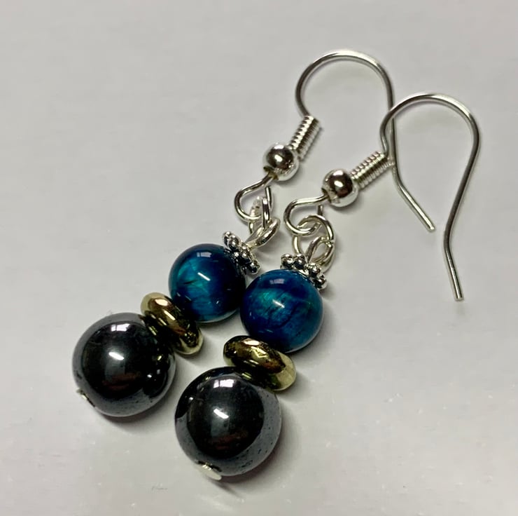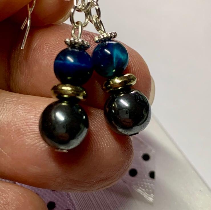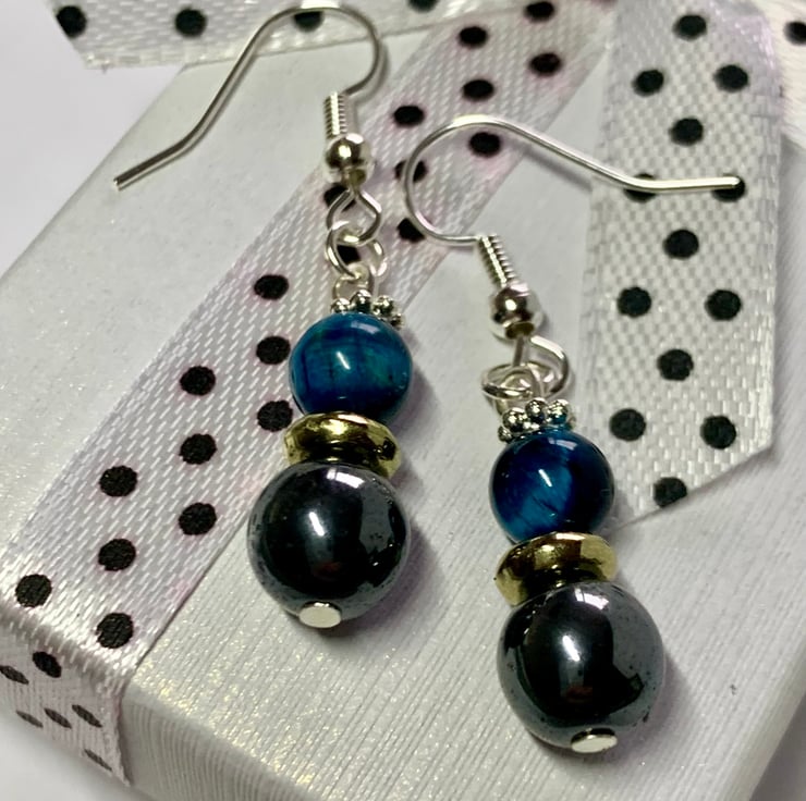 To those who do not like a long drop earring these are ideal. Simple, pretty drops handmade using Blue Tiger eye which has a beautiful chatoyancy running through contrasting with the gunmetal grey of the Hematite. I absolutely love how these two Gemstones look together.