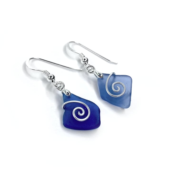 Sea glass dangly earrings, handmade in Scotland from cornflower blue beach glass with sterling silver hooks. The seaglass has been worn smooth and frosted after decades of tumbling in the sea! Each piece of sea glass is unique, making these earrings one of a kind and the slightly mis-matched colours and shapes, add to their charm.