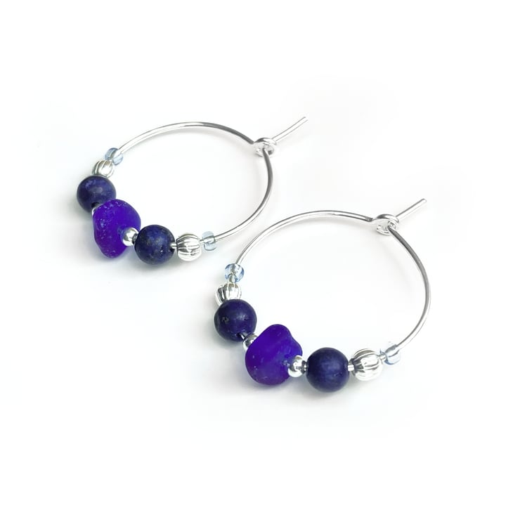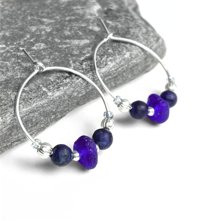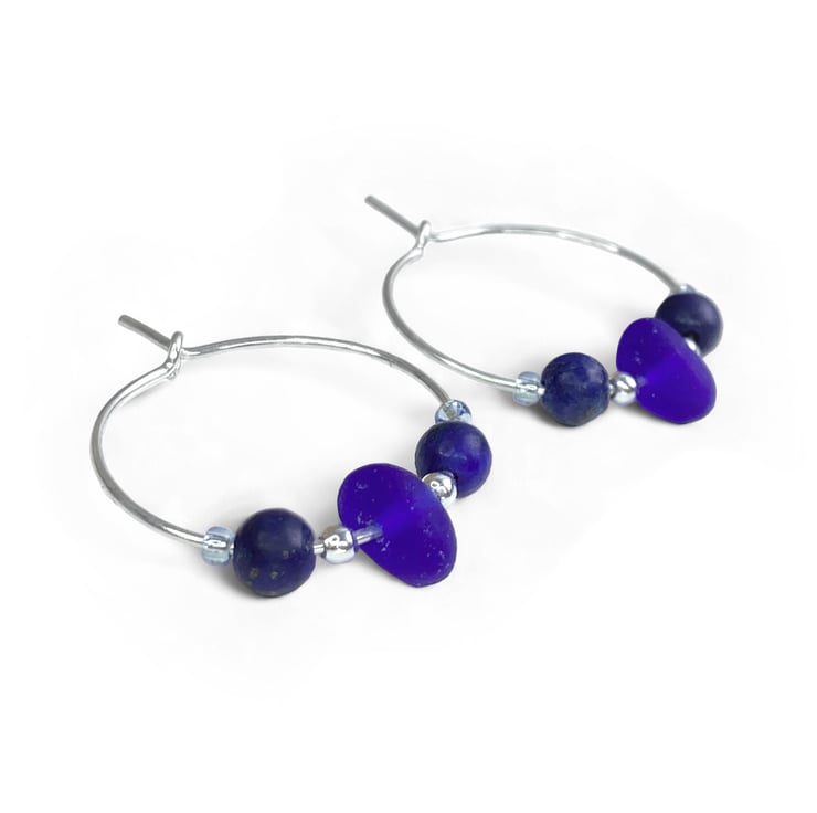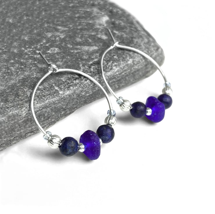 These delicate handmade hoop earrings feature dark blue tumbled glass – smoothed to resemble the frosted finish of sea glass and paired with natural Lapis Lazuli crystals, sterling silver and Czech glass beads.