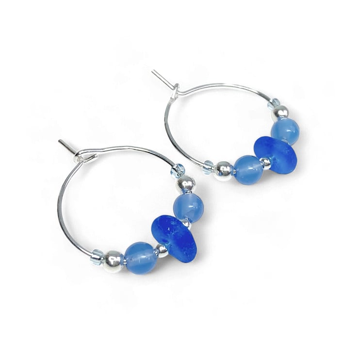 Blue Glass Hoop Earrings. Small Blue Sterling Silver Blue Onyx Beaded Hoops