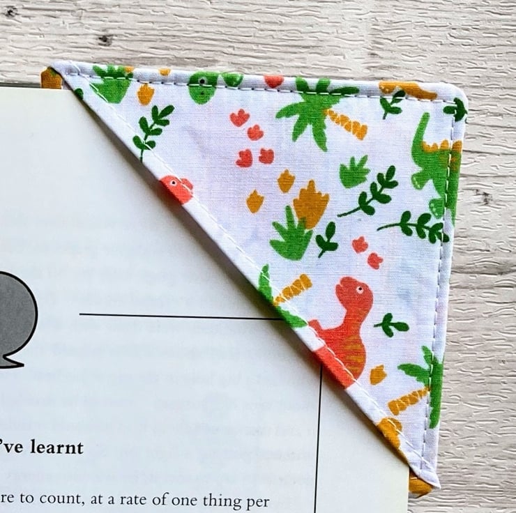 Dinosaurs white poly cotton fabric corner bookmark. Book lovers gift.