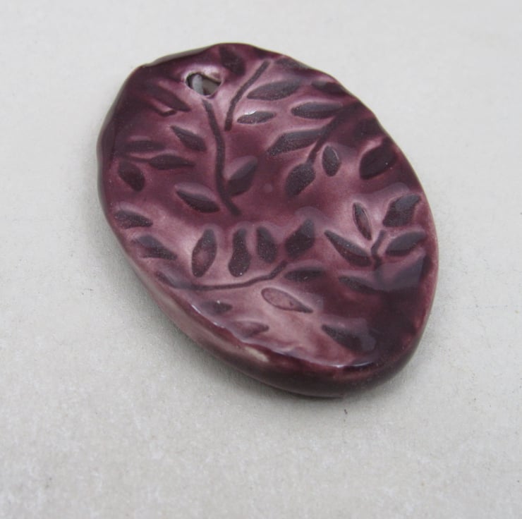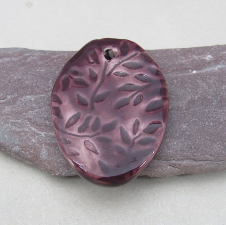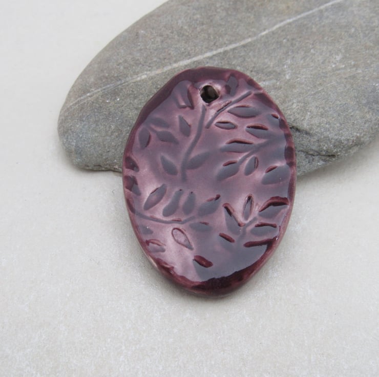 Large stoneware ceramic pendant, patterned with an embossed design of leaves and flowers, and finished with a dark aubergine purple glaze.